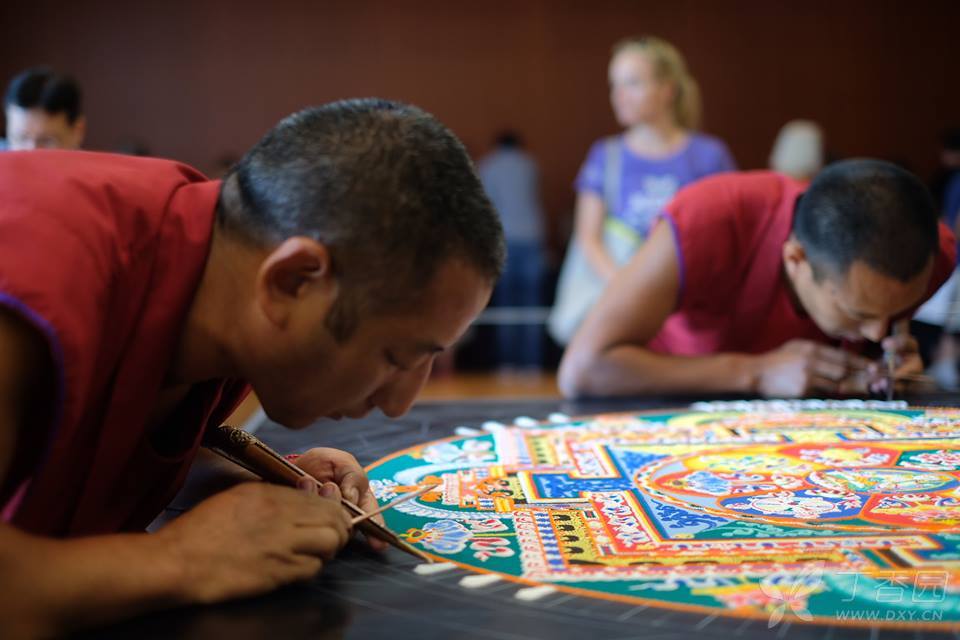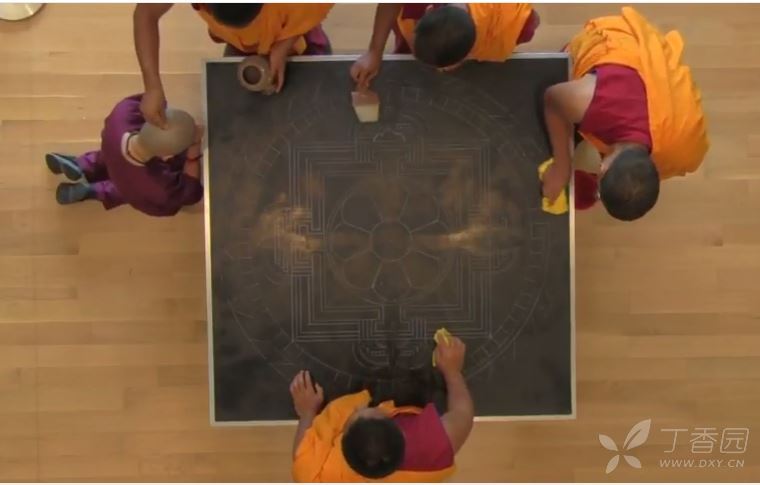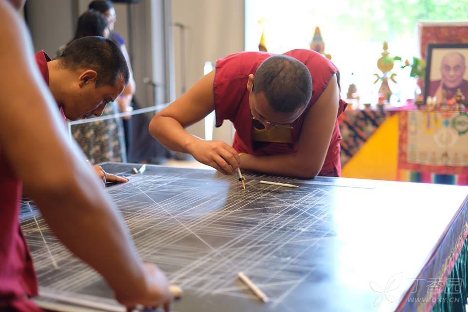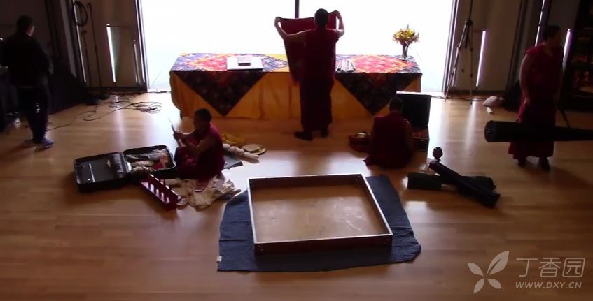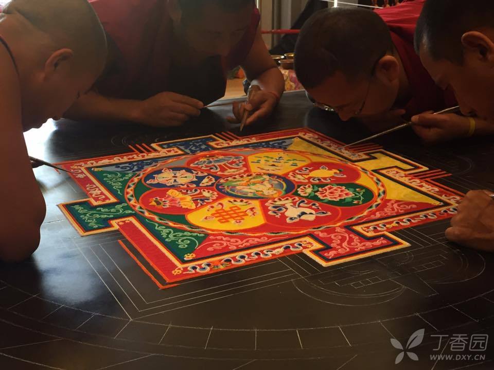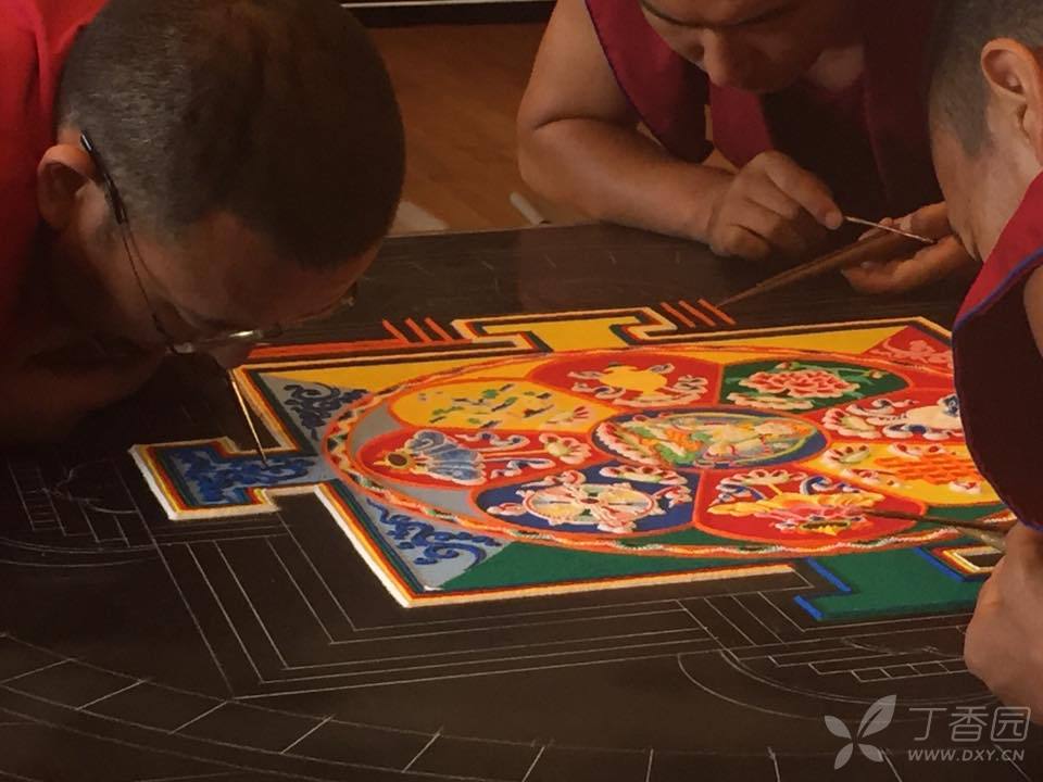 绘制坛城是一个艰辛而细致的过程,喇嘛要戴着口罩,事先磨成小颗粒状的沙子装在特制的锥形容器里,通过或轻或重的敲打控制流量,将沙子漏在模板上,细细堆砌、勾勒,而且要全神贯注、一丝不苟,稍有不慎,就要前功尽弃,依尺寸不同,需费时数日到数月不等的时间。