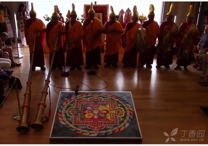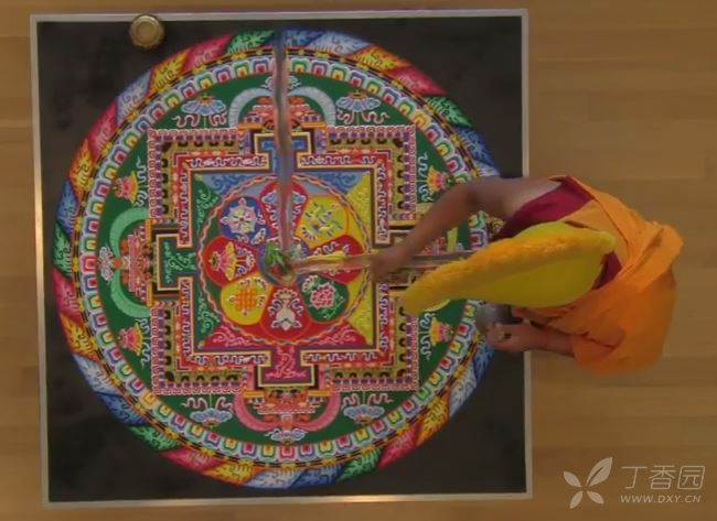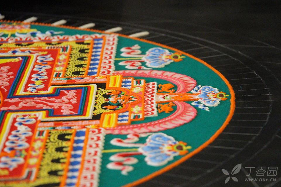 坛城是一个想象中的宫殿,如果把它称为画的话,它就是在平台上或正方形织物上的圆形绘画,多数坛城是用七彩的沙子或岩石粉末、谷物这些非永久的材料用手捻撒而成,过程有严格的规定和细节要求,结构、位置、长度、名字等关键的地方绝不能搞错,一般都是由经过训练的僧人执行,当然它也不是一成不变的。有的坛城边上还缀有锦缎作装饰,坛城有各种尺幅,大的一米见方,更大的坛城有五六平方米大小,色彩鲜艳,像一幅平铺的挂毯,又似精美的建筑模型,堪称宗教艺术一绝。仪式结束后,坛城会被故意毁坏,这些沙会被打扫干净并且倒进附近的溪流或河里,因此说它几近于今日之行为艺术。