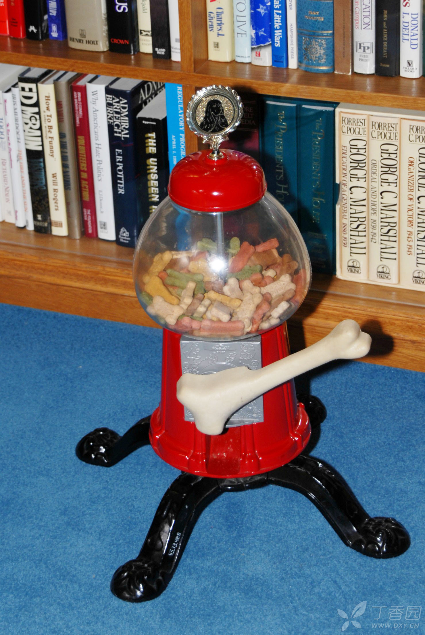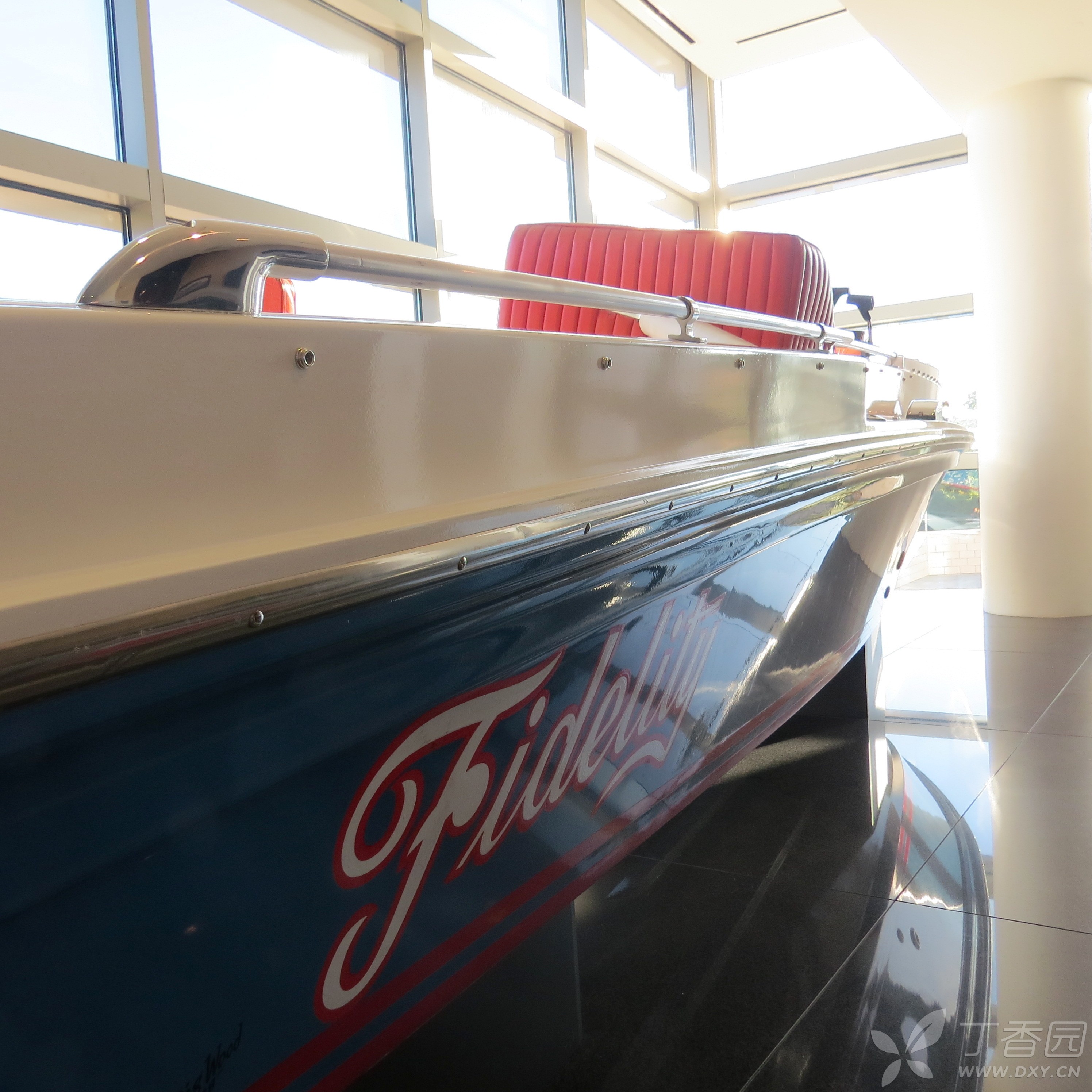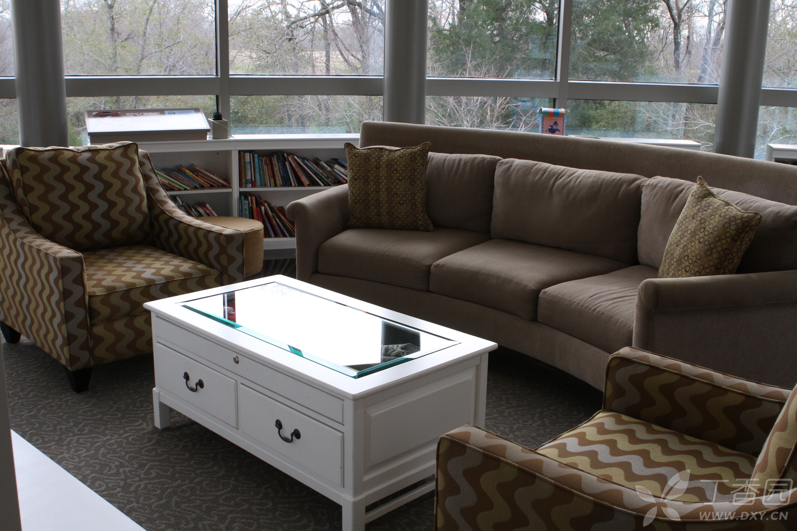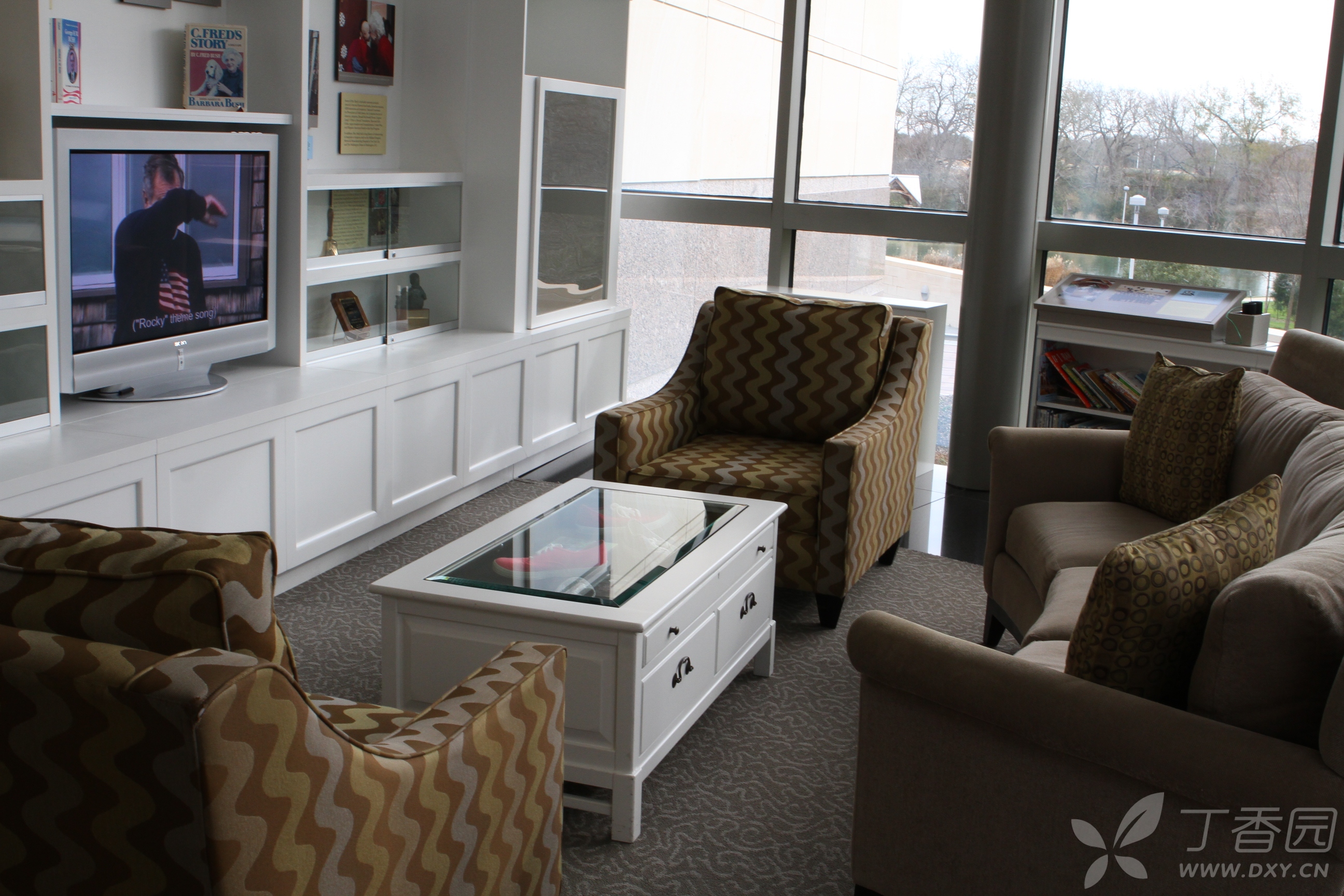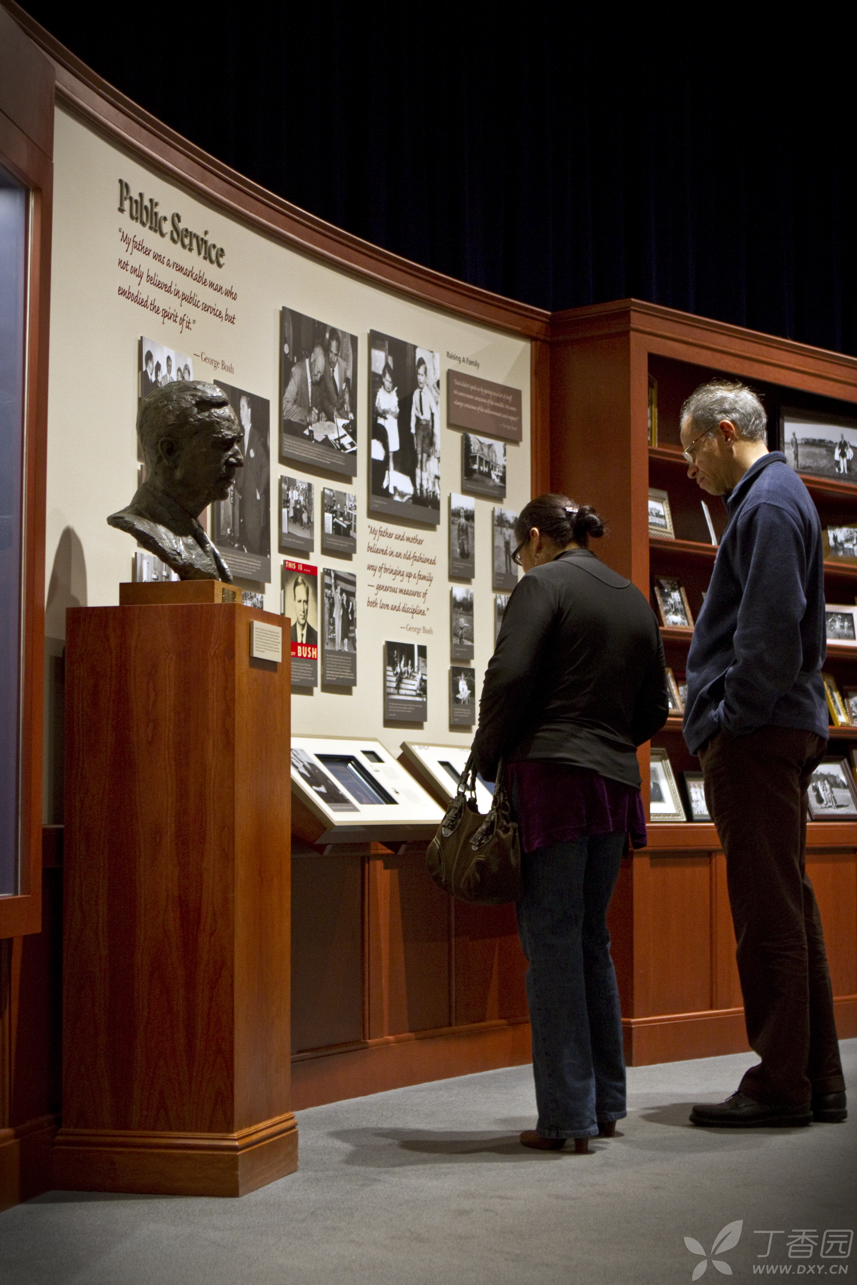 在图书馆内的一个画像前,设立了一个老布什铜雕坐像,旁边有两把椅子,游人可以与其合影。