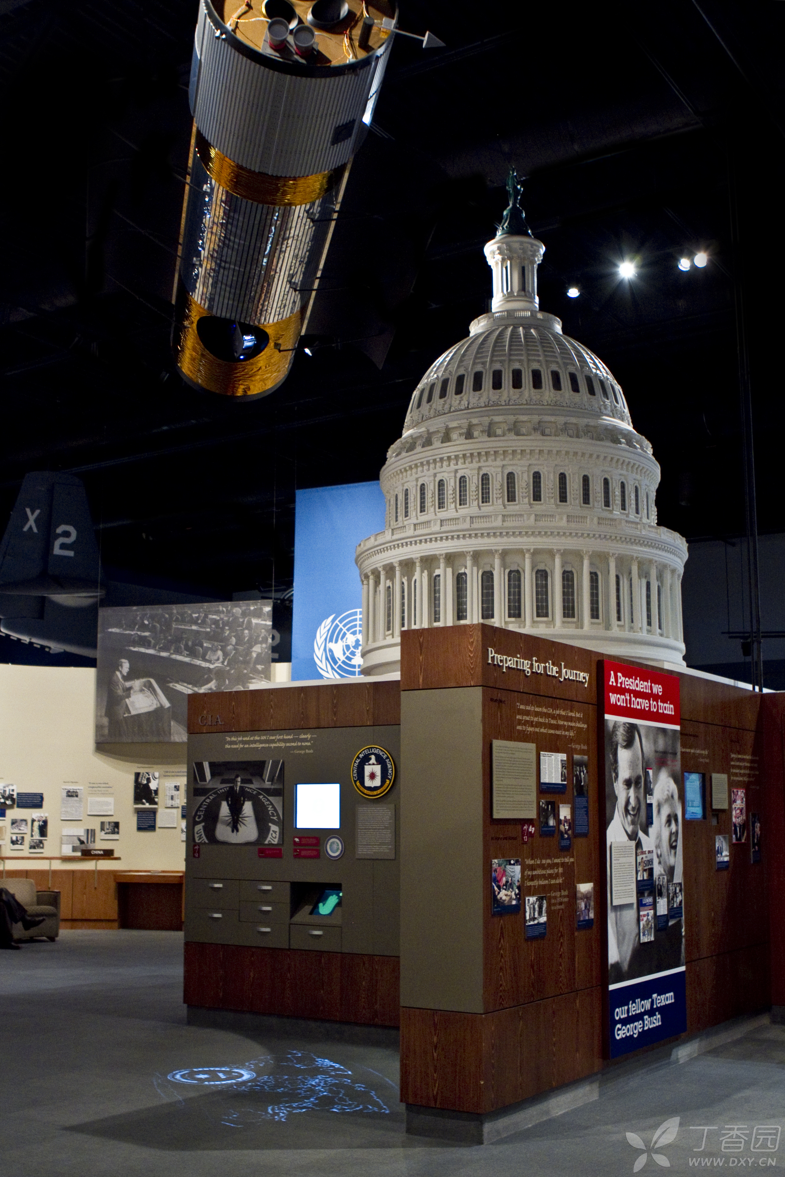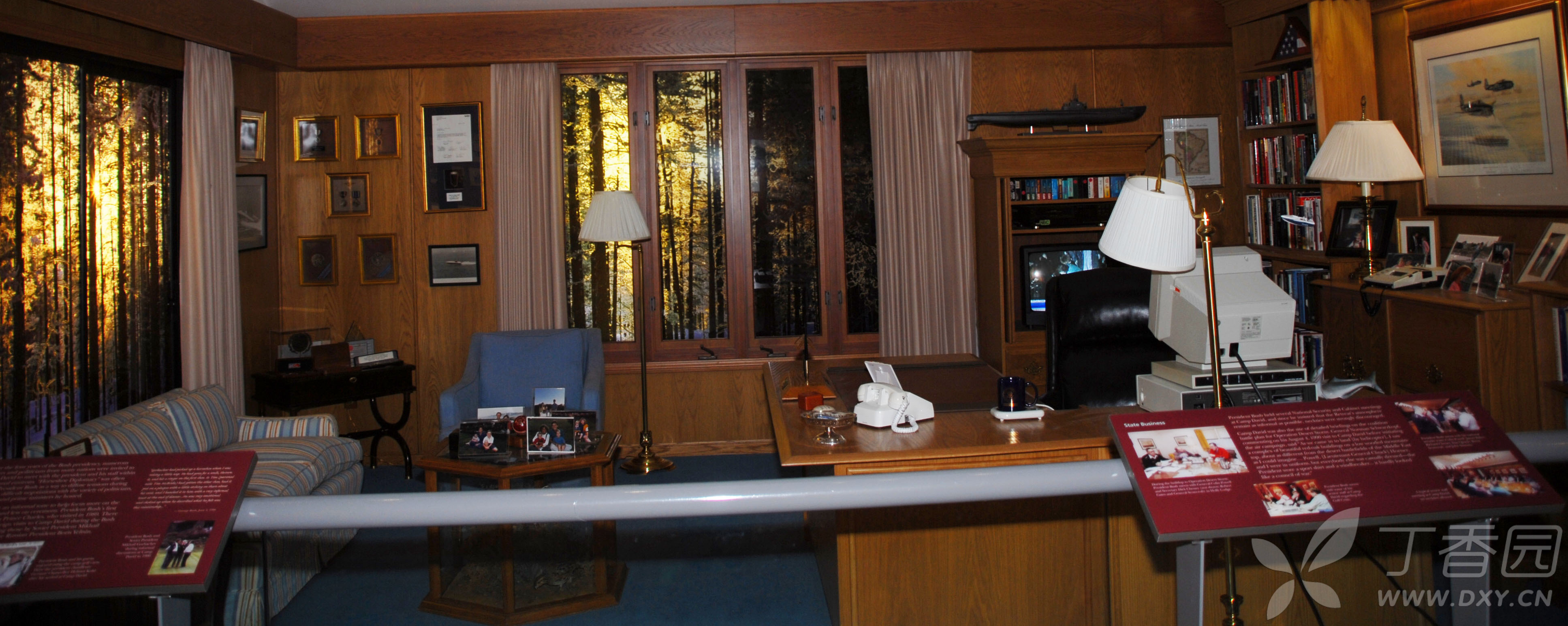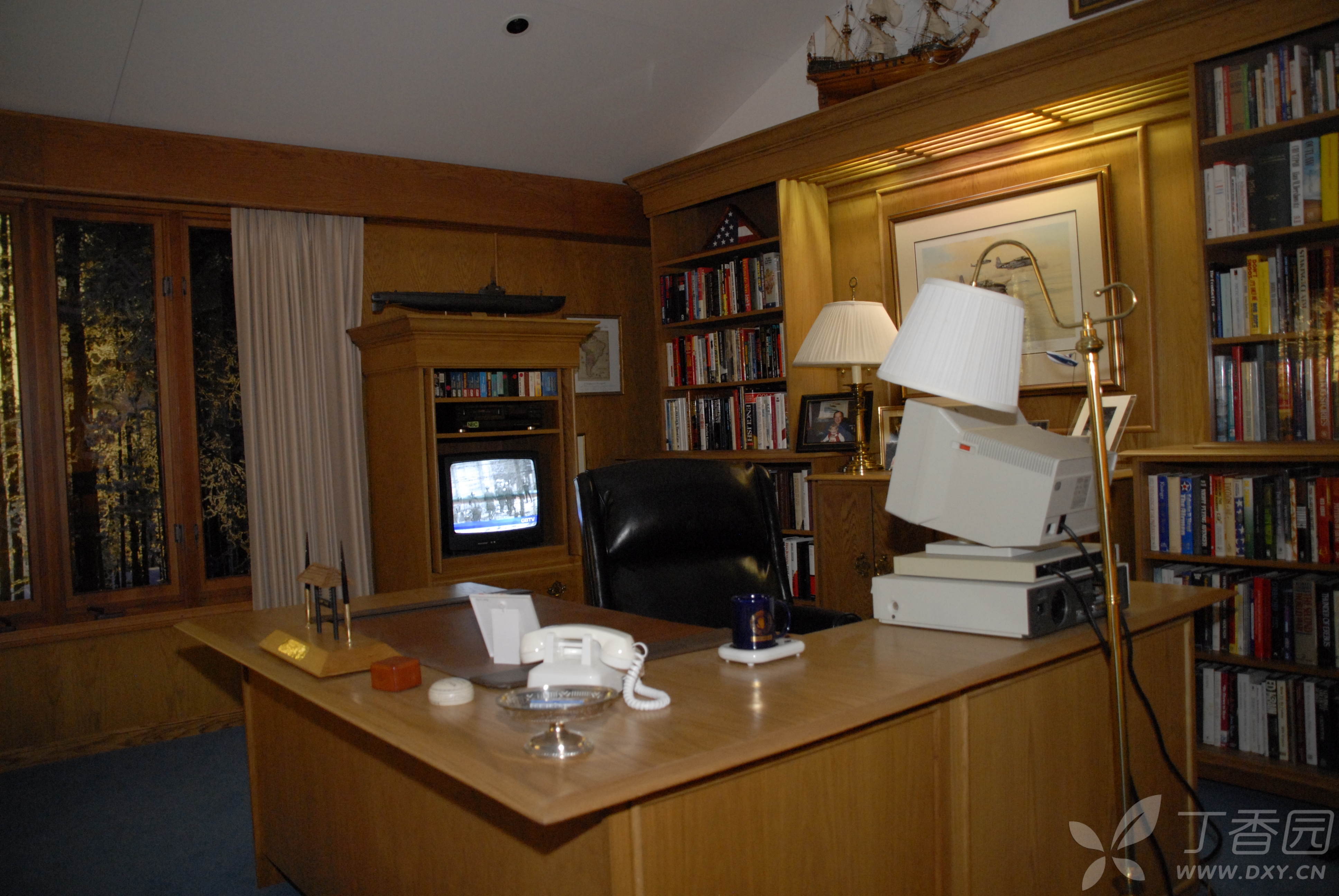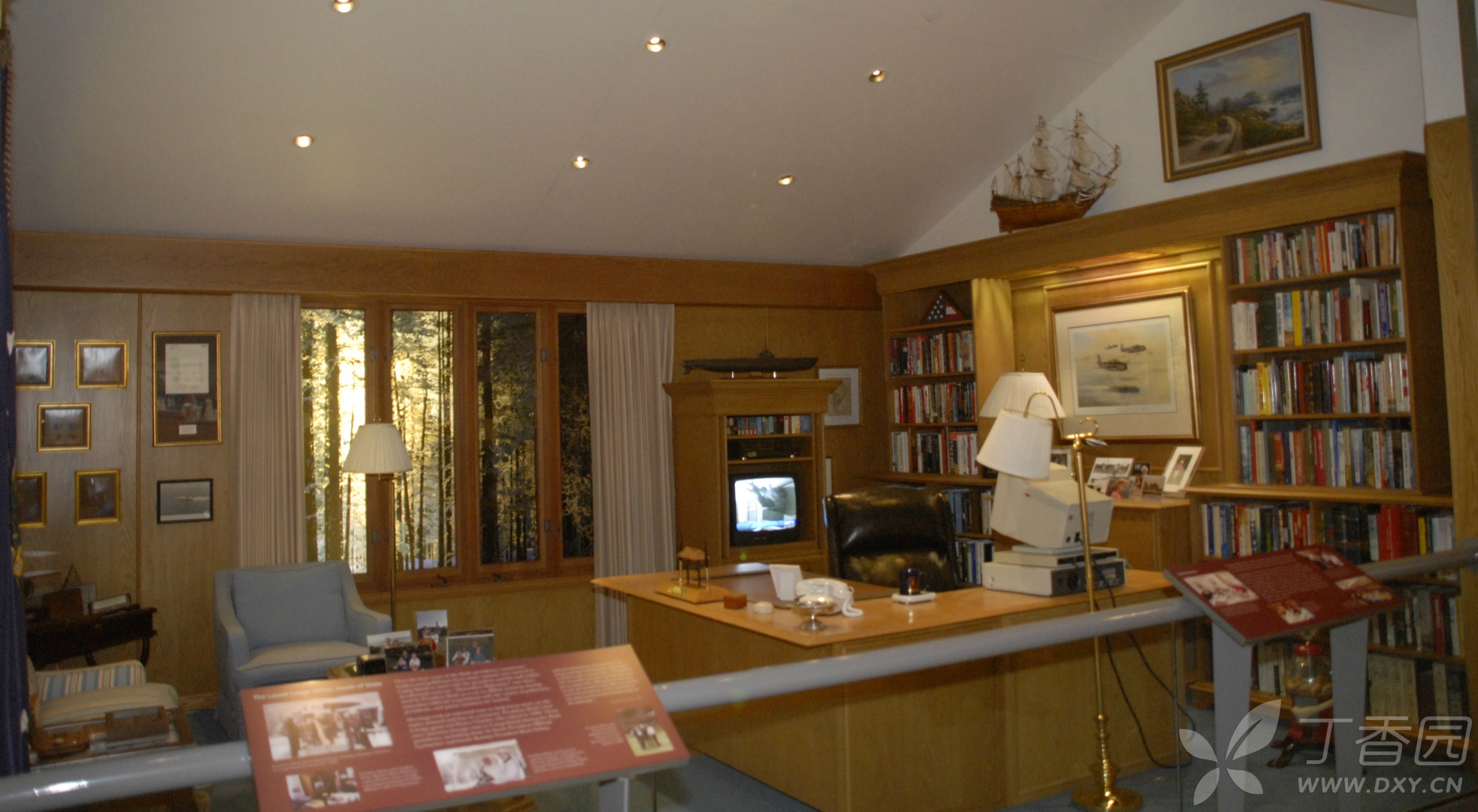 当然,在馆中展出最多的还是老布什作为美国总统时的东西和场景。比如在馆中展出了一幅巨大的老布什与幕僚们在白宫办公室的画像放在醒目位置。
