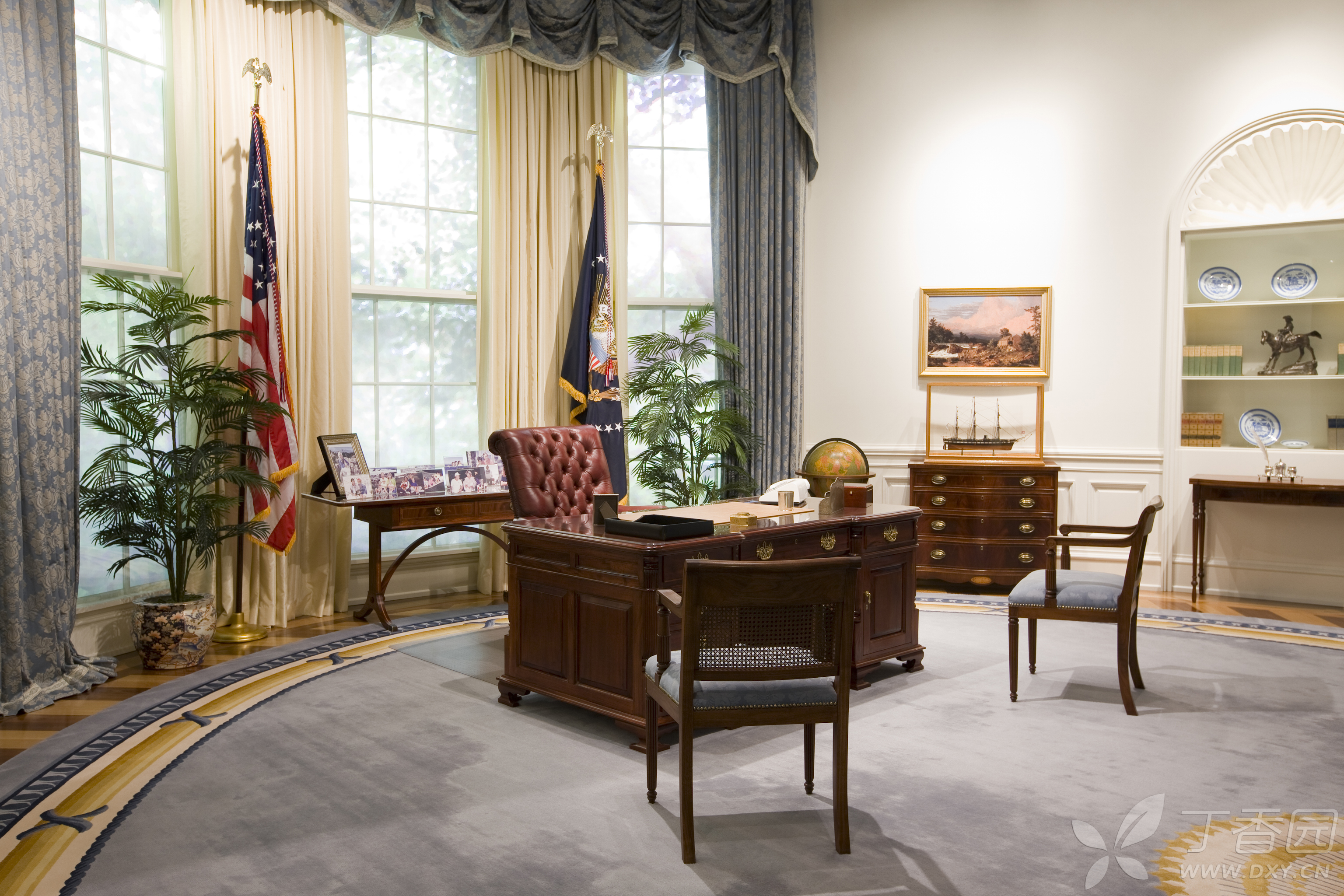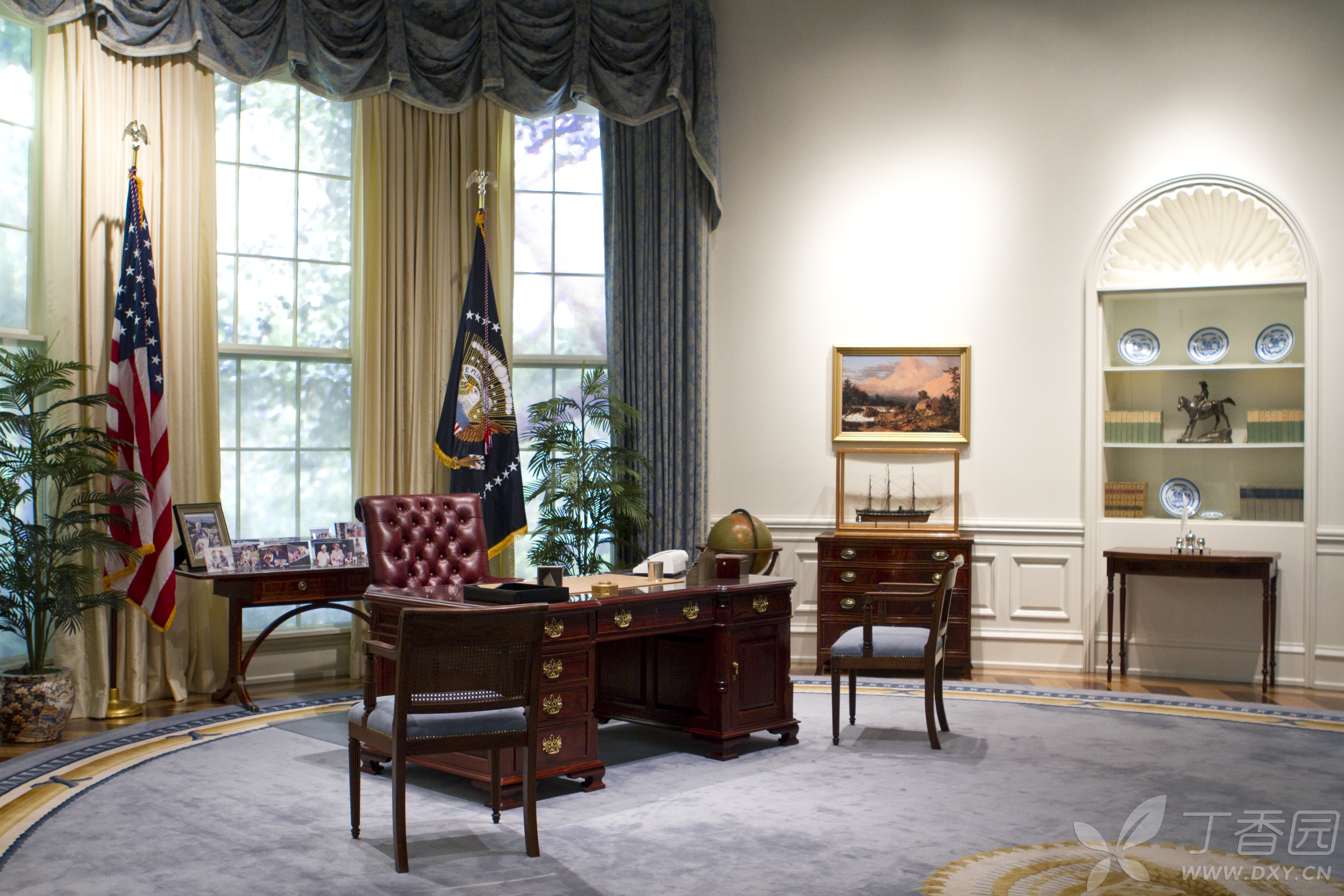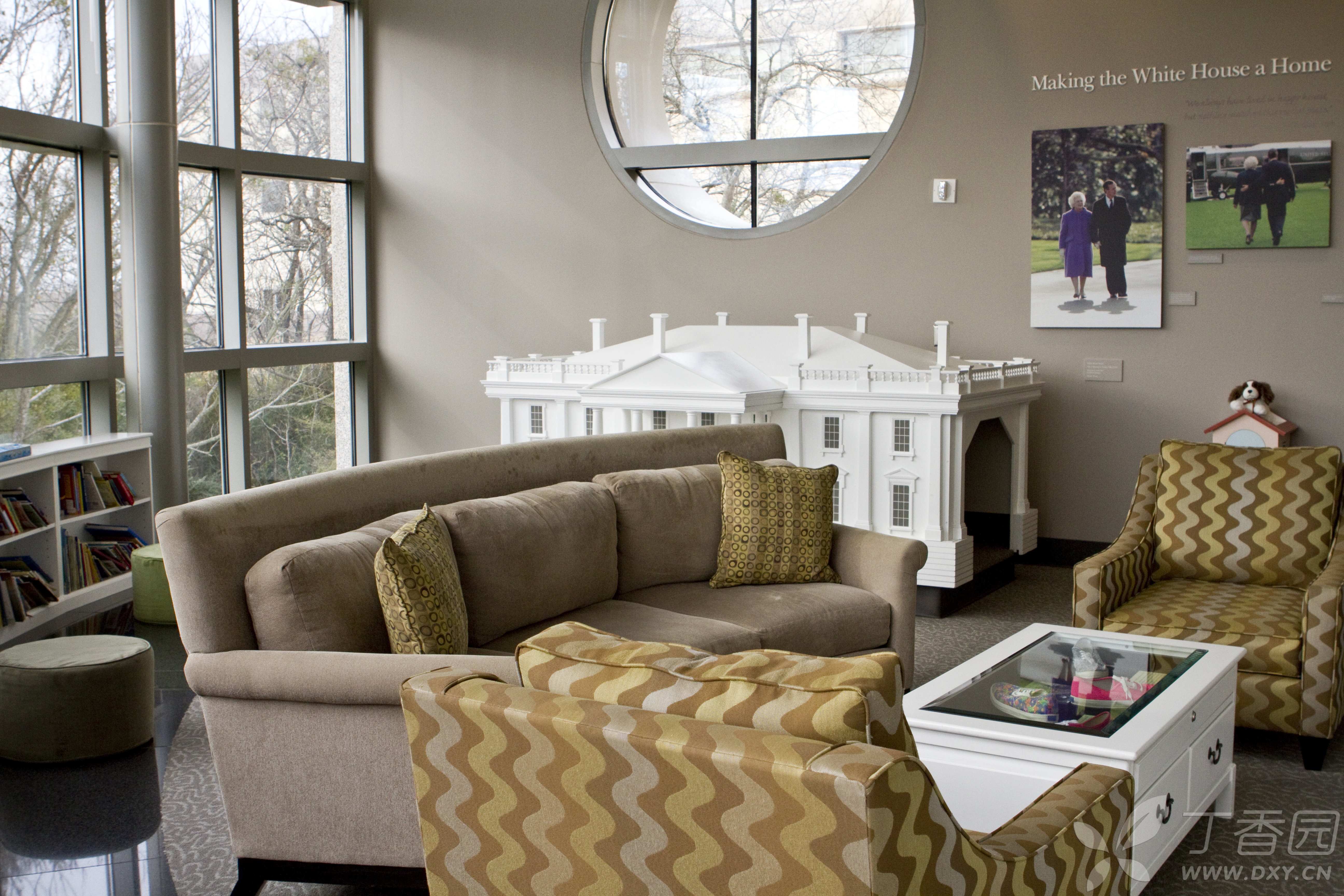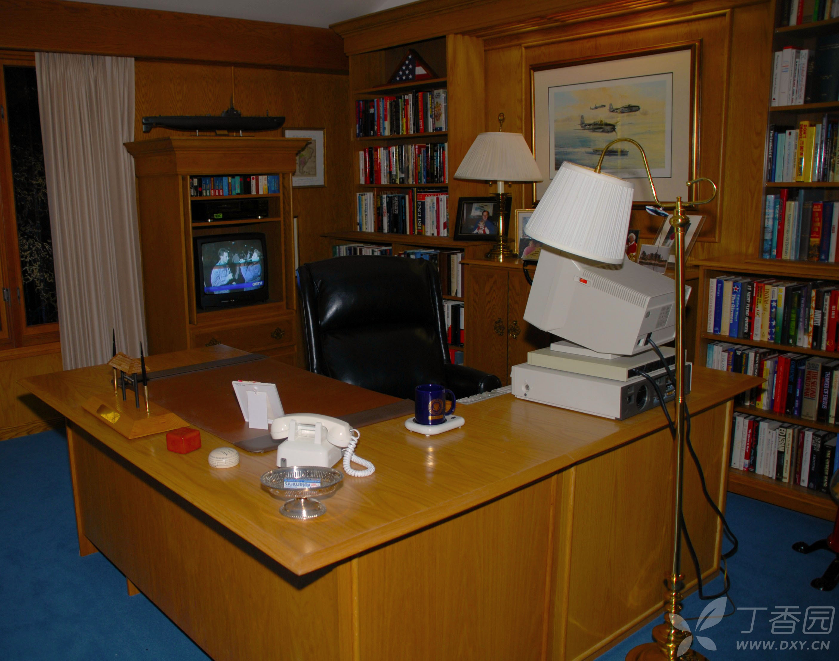 当然,在馆中展出最多的还是老布什作为美国总统时的东西和场景。比如在馆中展出了一幅巨大的老布什与幕僚们在白宫办公室的画像放在醒目位置。