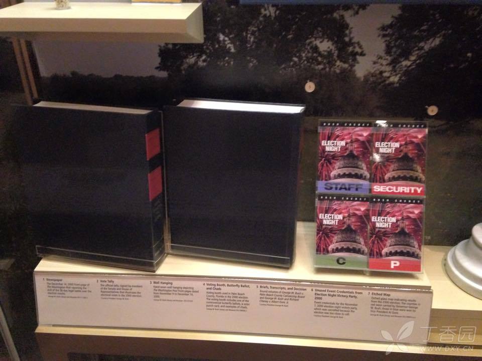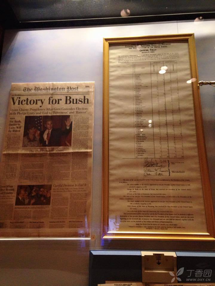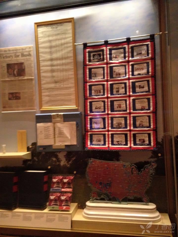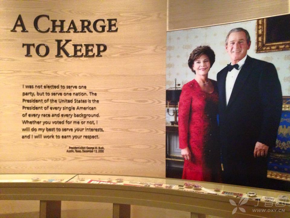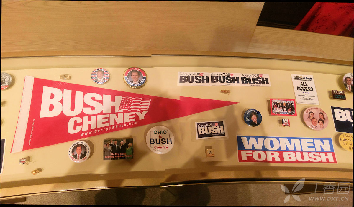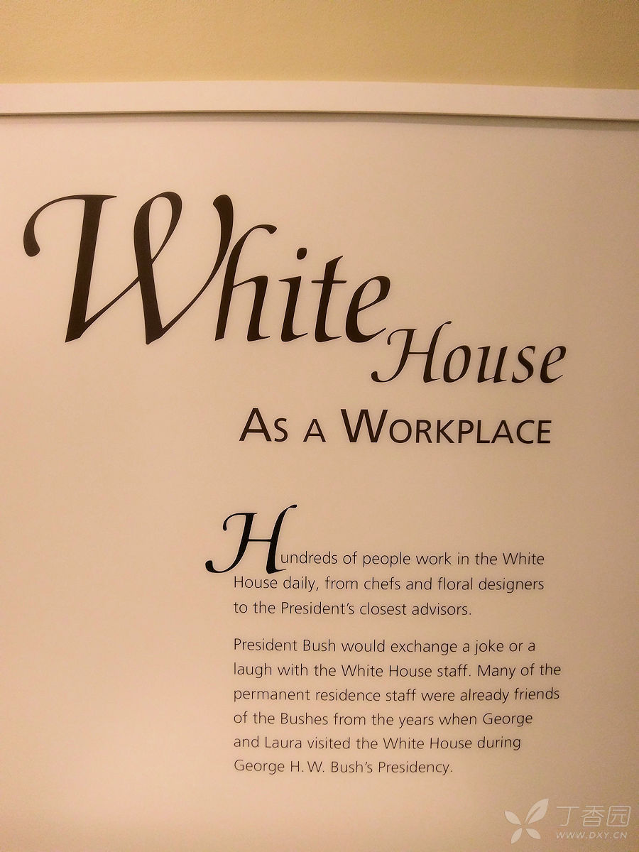 下一个展厅是白宫生活,就是美国总统夫妇在白宫的衣食住行,包括详细的白宫平面图,餐厅的餐盘,出席宴会时候的服装,平时在草地上玩棒球的球帽等。 在图书馆中还看到了小布什总统丰富多彩的另一面,他喜欢绘画,他的画作红雀栖息在枝头,被夫人劳拉选为博物馆节日装饰品,并被制作成金属三维艺术作品出售。绘画是小布什总统退休后一大爱好。至今他还坚持每周都去上绘画课,画的最多的是马、犬和静物。连克林顿总统都幽默地请求小布什给他画一幅穿衣服的肖像。一位卸任后的总统能有此等闲情逸致及对待生活的积极态度和对生活的热爱是多么的难能可贵。大厅的右侧展馆中,展出的是小布什总统在白宫岁月的圣诞树,以及历史上从第一任总统到第四十三任总统及夫人的肖像和他们居住房屋的模型,并简要的介绍了他们的生平及在任期限和主要功绩。