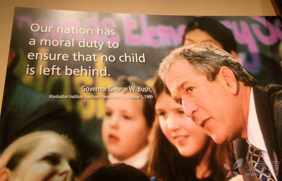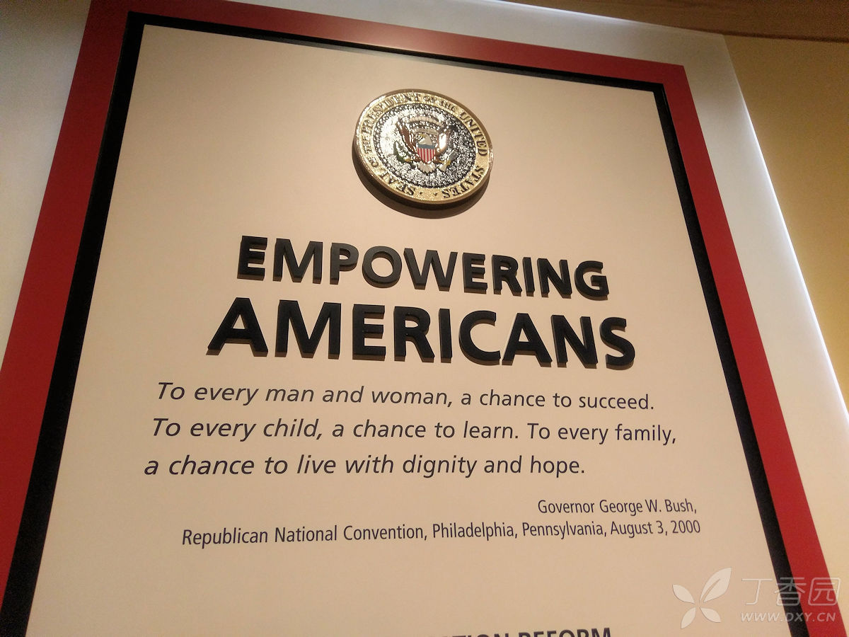 向前走入小布什的教育政策展览,在那里看到他为了解决小学生识字难的问题所制定的政策。如展品中举例的那样,当时,很多学生到了3、4年级还无法理解一段英文段落的内容。他喊出了“无人落后”的口号,在他任期内所有小学教师,都必须保证没有一个孩子真的学习落后。在经济政策上,他倡导刺激就业,取得一定成效。