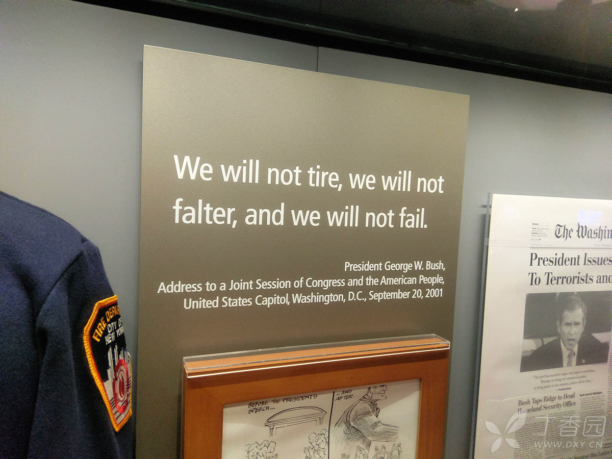 离开小剧院,进入下一个展馆,就是911纪念展。首先映入眼帘的是一端褐色的钢筋,直冲屋顶,应该就是当年911世贸大楼的遗骸。旁边的墙上是死难者名单,包括大楼内的工作人员,和遇难飞机上的乘客。展厅中详细介绍了911前美国总统的行程,对于布什而言,911前几天都是正常的外访计划,故而,本拉登的袭击基本在他的意料之外。恐怖袭击之后,布什做了不少批示和演讲,展厅上方的荧幕播放的,是他部分的演讲。下面的玻璃橱内,是他相关的手稿,和在一些打印演讲稿上的划线批注。在“9.11”展台中,在厅中央展出有两根被高温烧灼呈扭曲状的钢铁板,这是恐怖分子用飞机撞击高楼留下的残片,也是恐怖分子对无辜人民犯下的铁的罪证。“9·11”被恐怖分子炸毁的纽约世贸中心的钢梁——那时正是小布什当政,他发誓要报复,“恐怖主义攻击可以动摇我们最大建筑物的地基,但无法触及美国的基础。他们摧毁得了钢铁,但丝毫不能削弱美国钢铁般的坚强决心。”