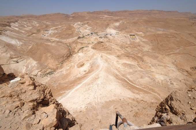 马萨达是犹太人的圣地,联合国世界遗产之一。位于犹地亚沙漠与死海谷底交界处的一座岩石山顶,北距EnGedi约25公里。其东侧悬崖高约450米,从山顶直下死海之滨;西侧悬崖高约100米。山顶平整,呈便菱形,南北长约600米,东西宽约300米,周围城墙长约1400米。通向马萨达的自然道路都极为险峻,最主要的是东侧的“蛇行路”(SnakePath)。