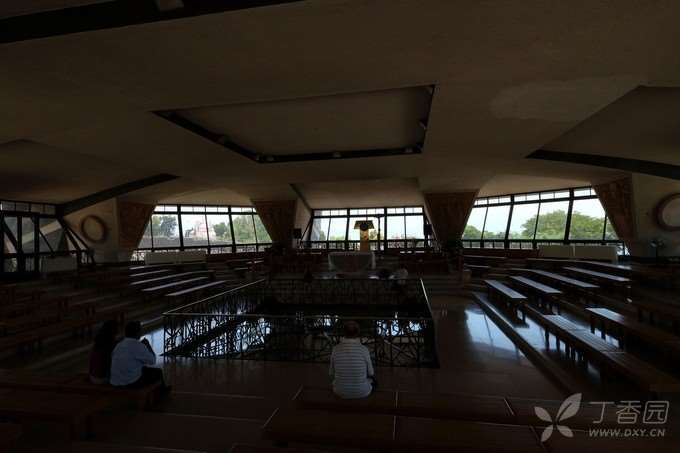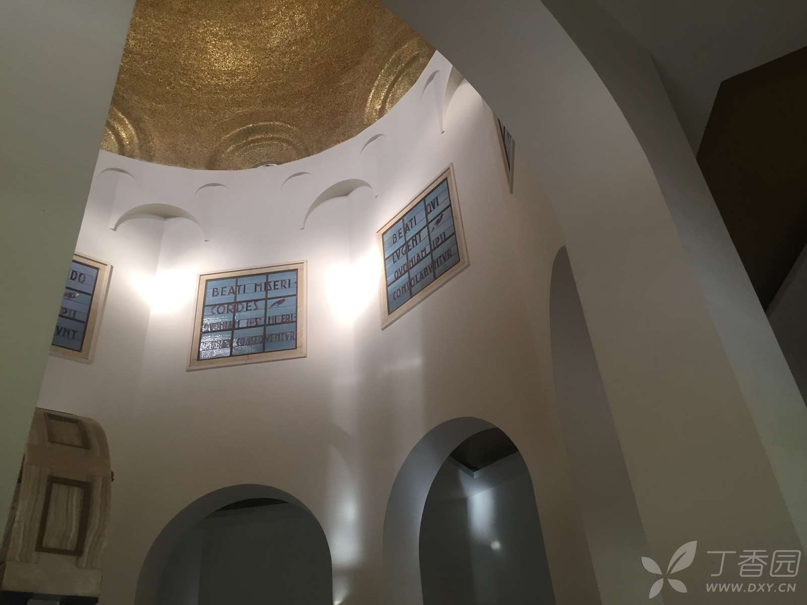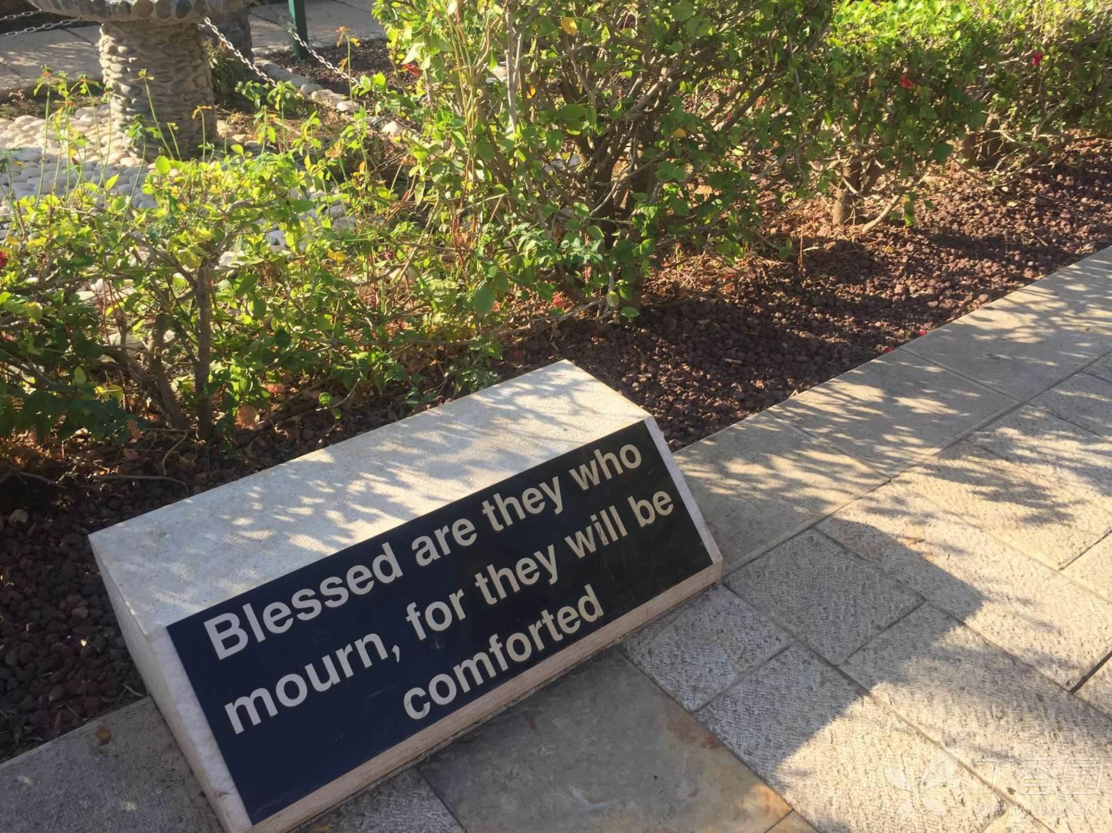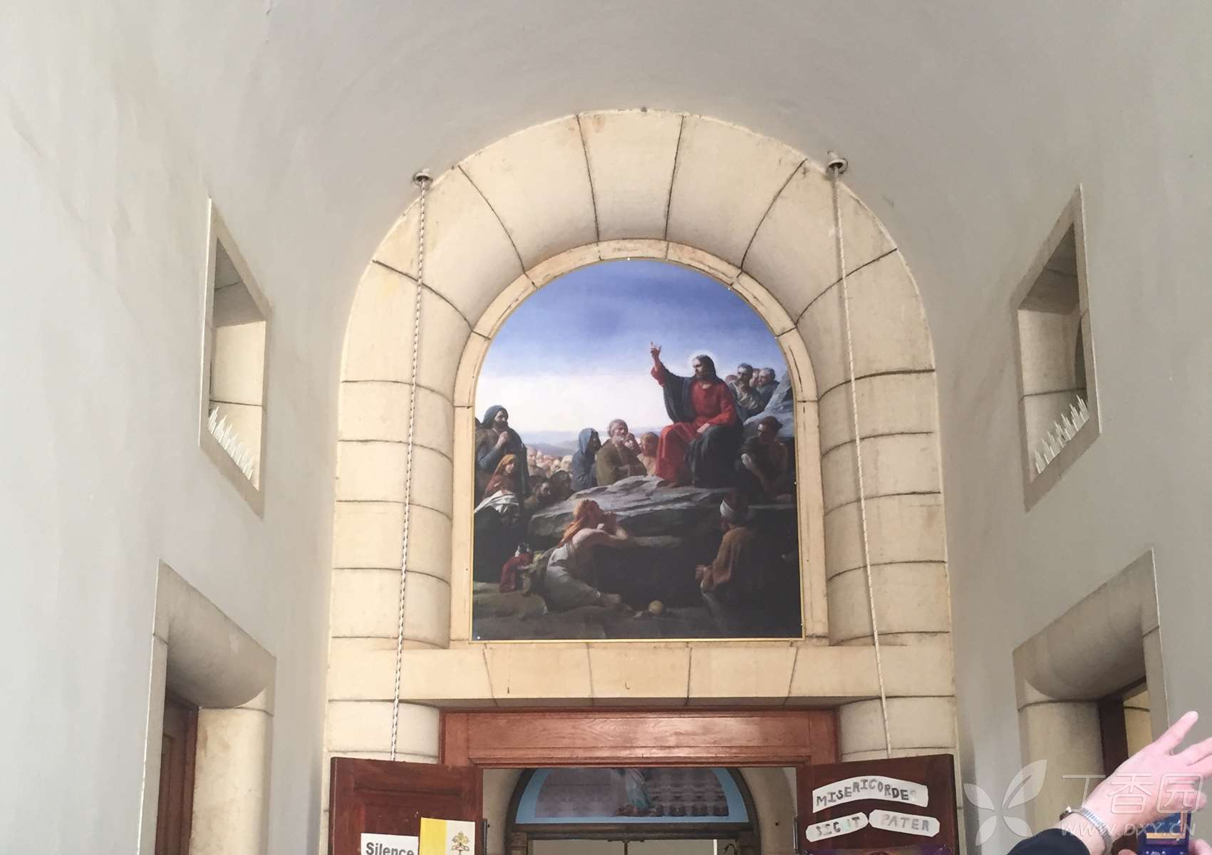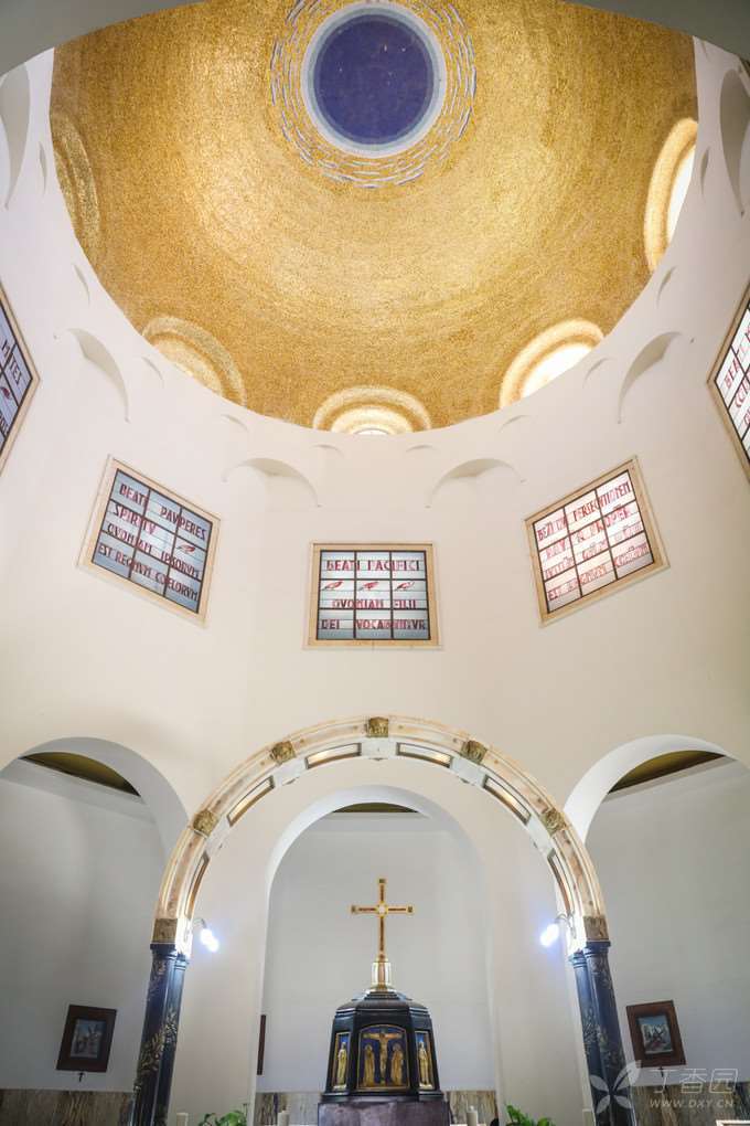 这是一座造型优雅的建筑物,用当地的黑色玄武岩建成,只有周边的圆拱用拿撒勒的白色岩石所造,四周环绕着的一圈白色石柱,是用罗马的石灰华(也叫钙华,来自泉水中的石灰质)制成。这也是一个现代建筑,走进大门,面前是八福堂,脚下是圣经的八福,身侧就是美丽的加利利湖。