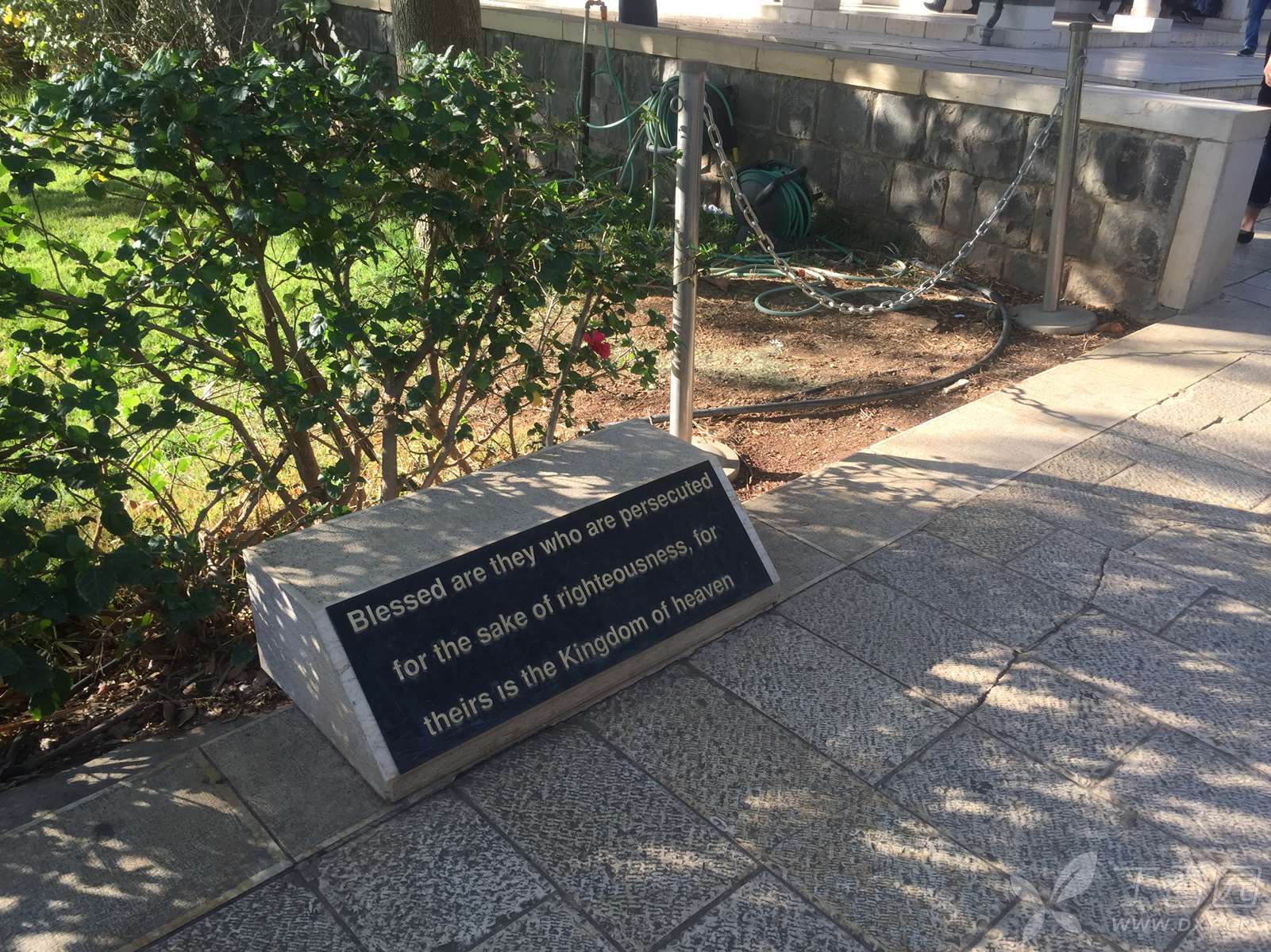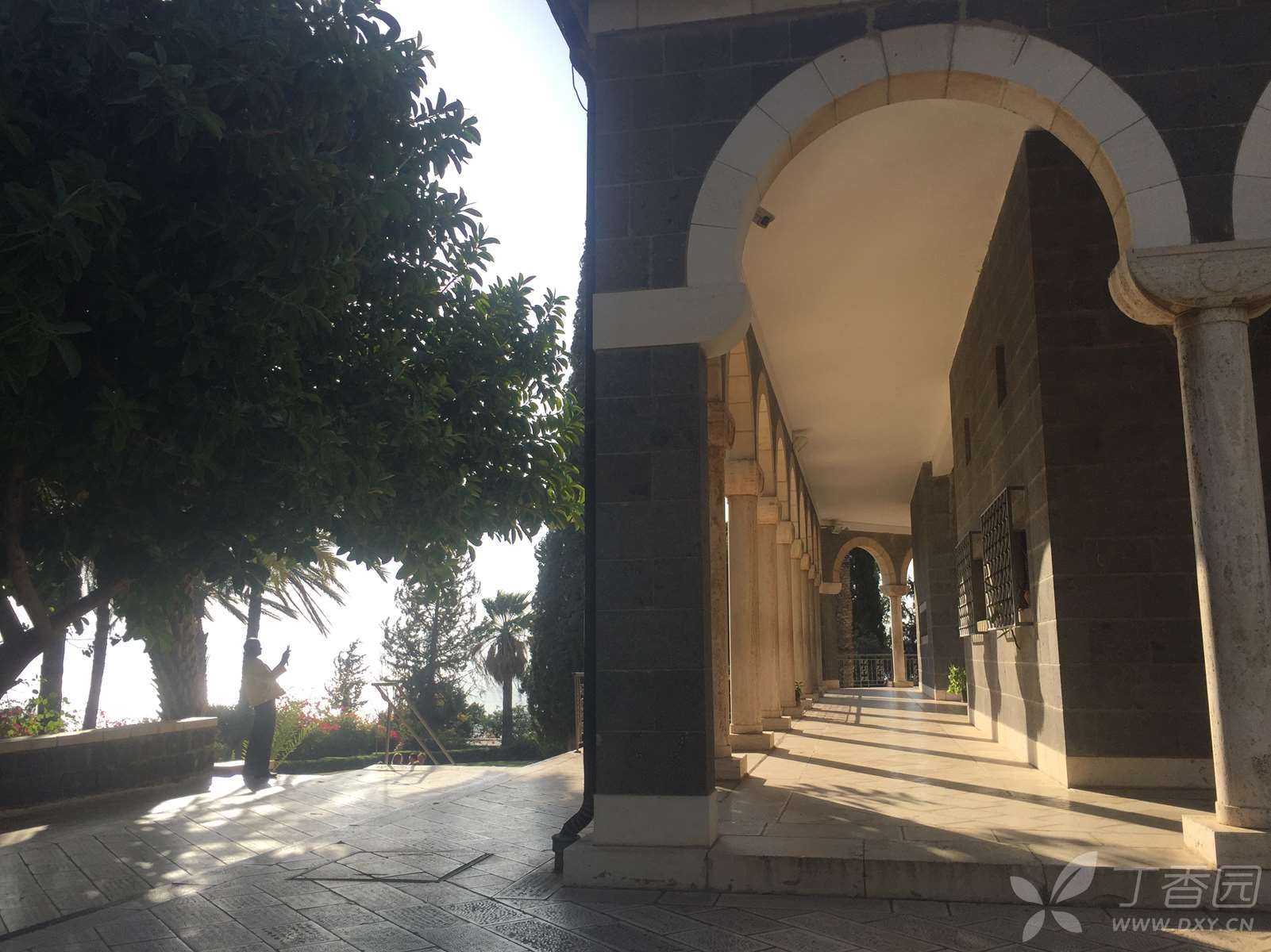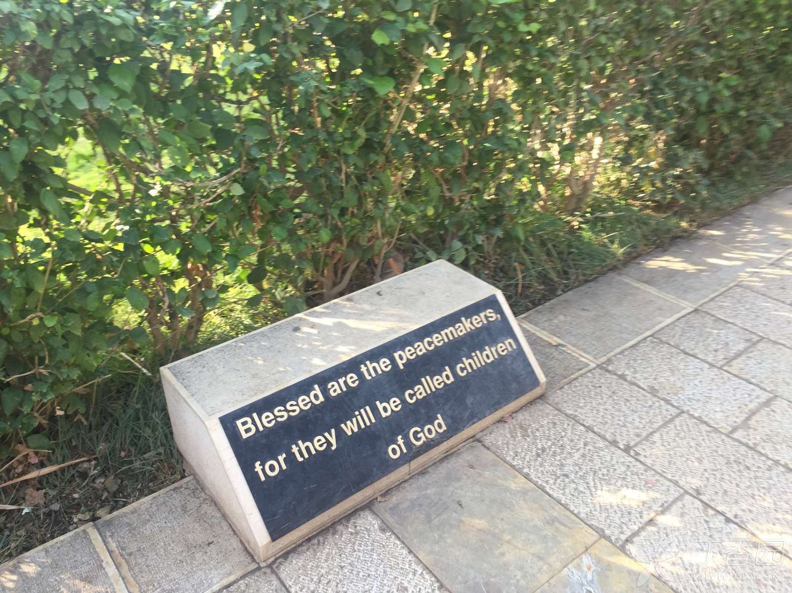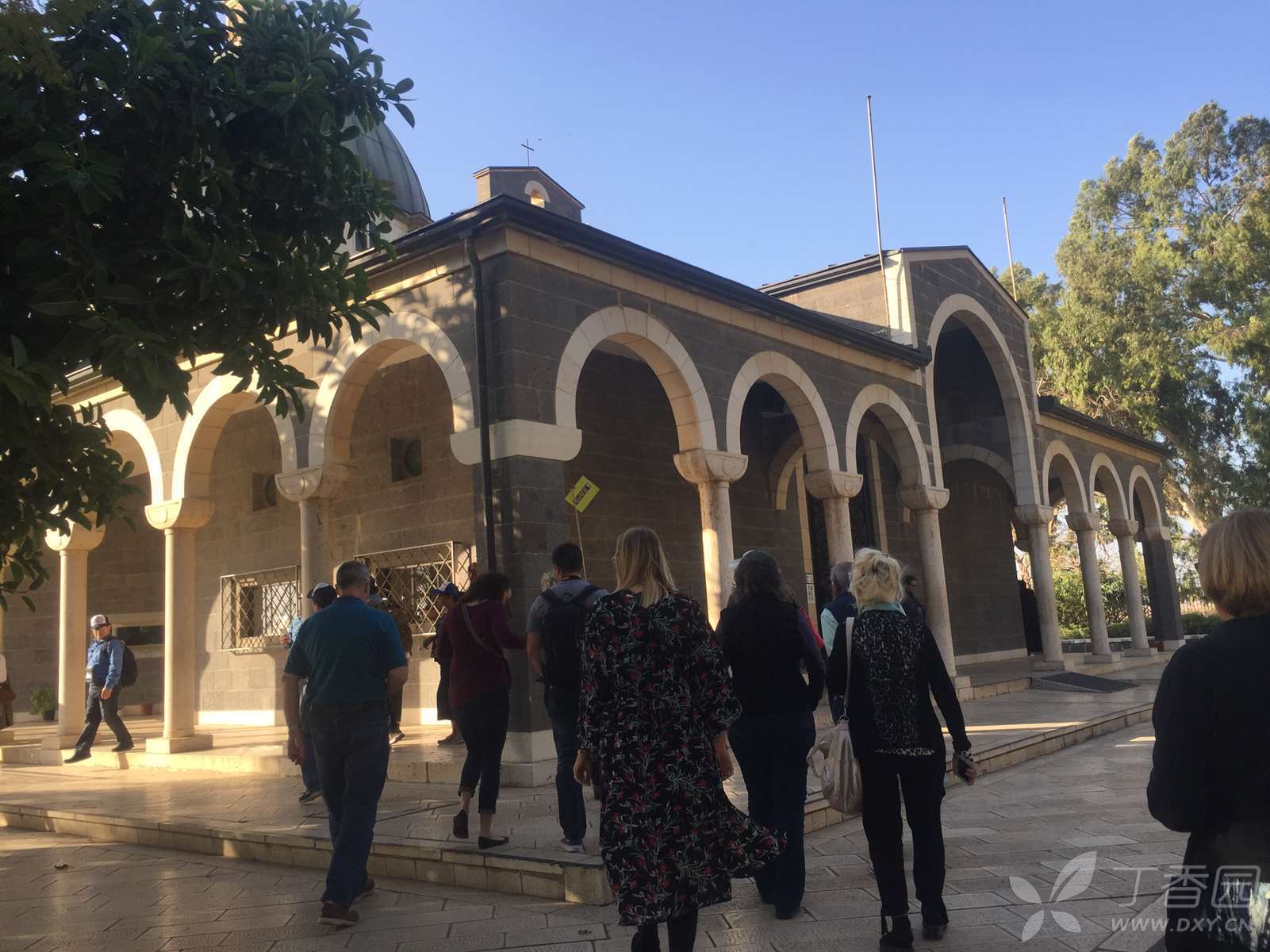 这是一座造型优雅的建筑物,用当地的黑色玄武岩建成,只有周边的圆拱用拿撒勒的白色岩石所造,四周环绕着的一圈白色石柱,是用罗马的石灰华(也叫钙华,来自泉水中的石灰质)制成。这也是一个现代建筑,走进大门,面前是八福堂,脚下是圣经的八福,身侧就是美丽的加利利湖。