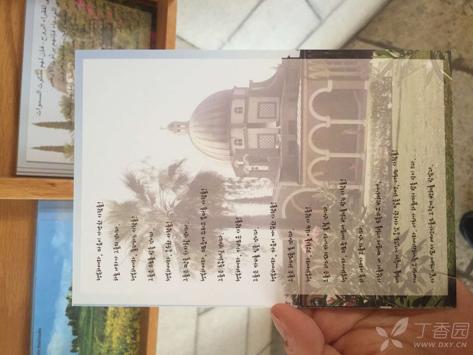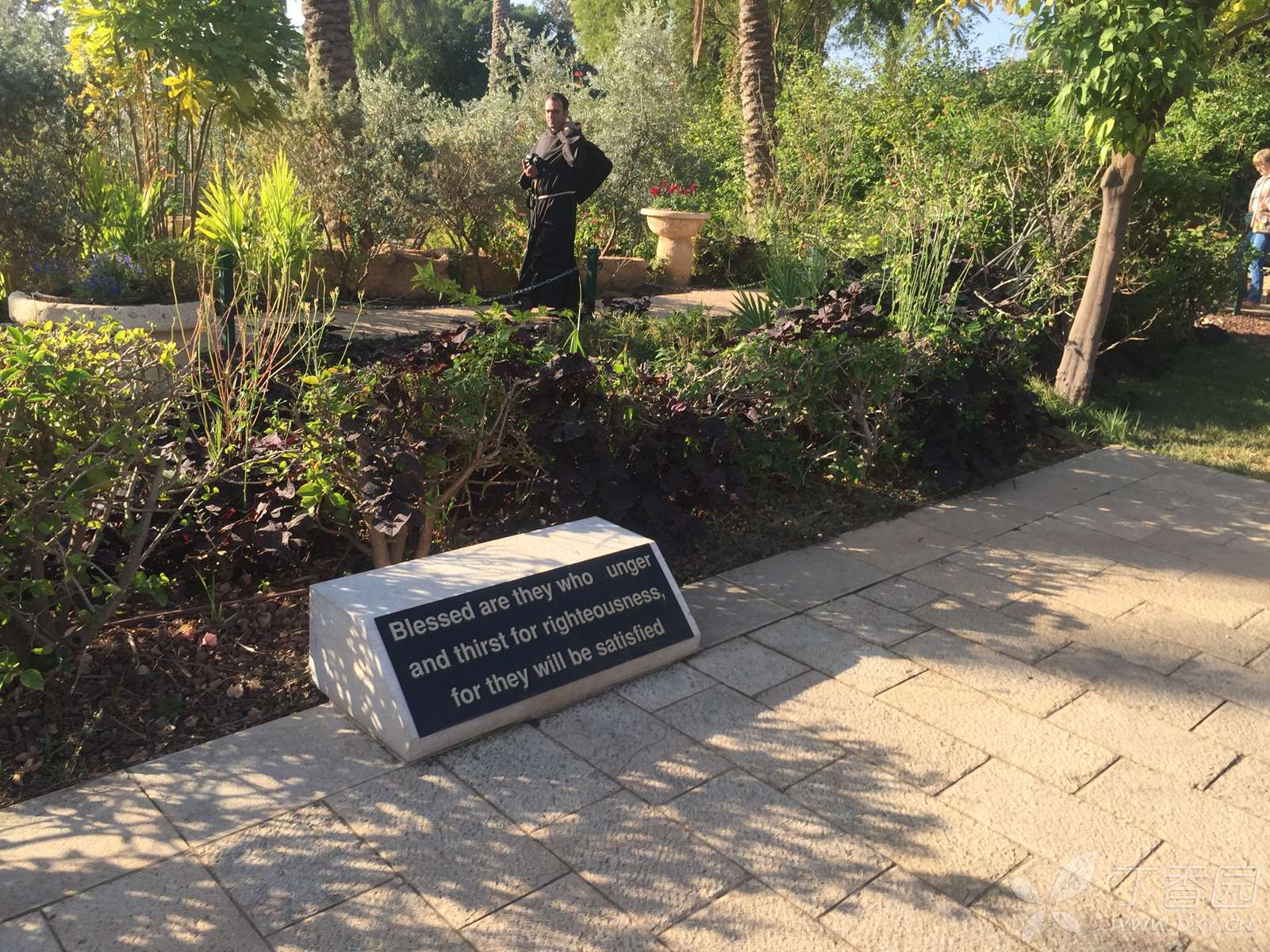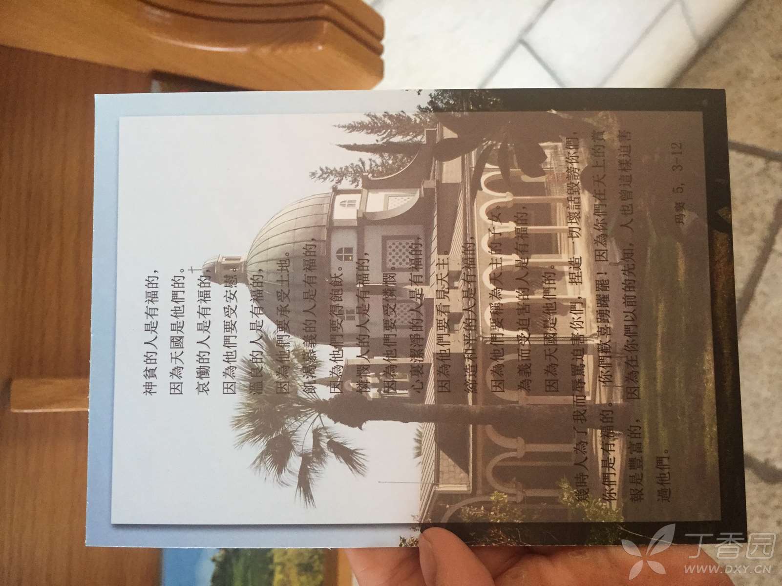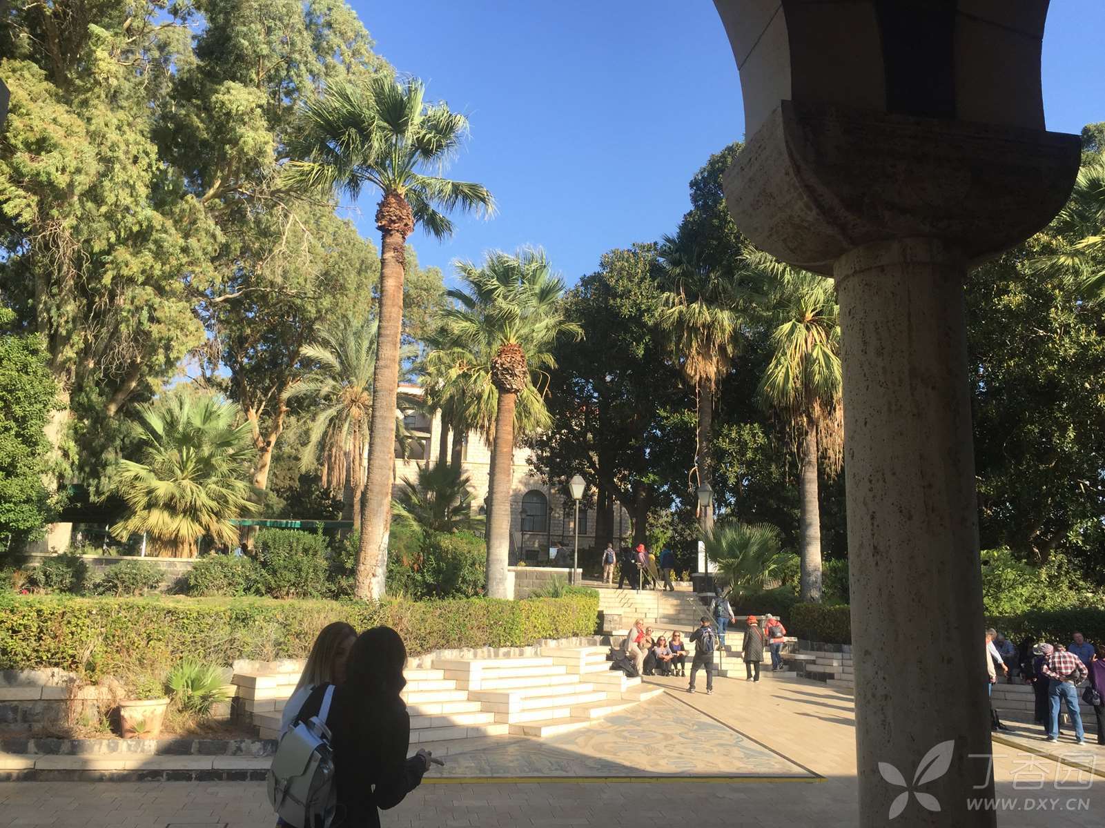 这是一座造型优雅的建筑物,用当地的黑色玄武岩建成,只有周边的圆拱用拿撒勒的白色岩石所造,四周环绕着的一圈白色石柱,是用罗马的石灰华(也叫钙华,来自泉水中的石灰质)制成。这也是一个现代建筑,走进大门,面前是八福堂,脚下是圣经的八福,身侧就是美丽的加利利湖。