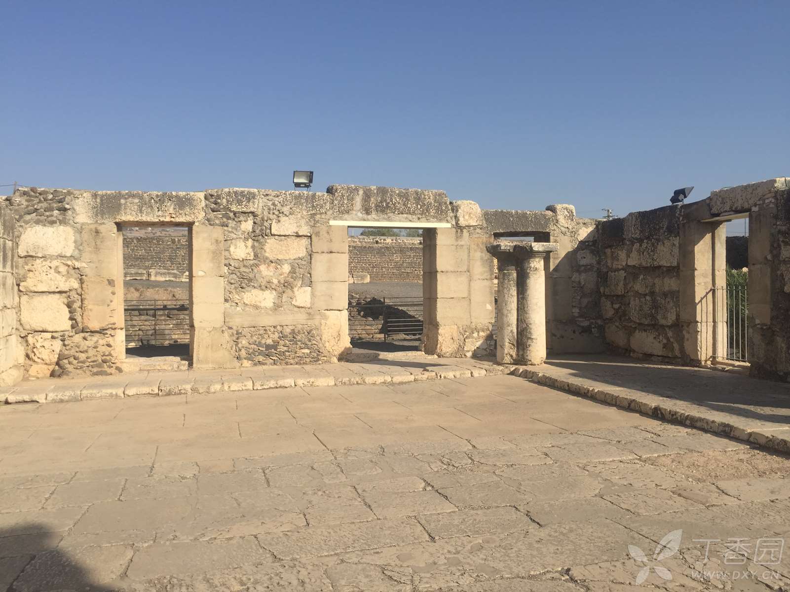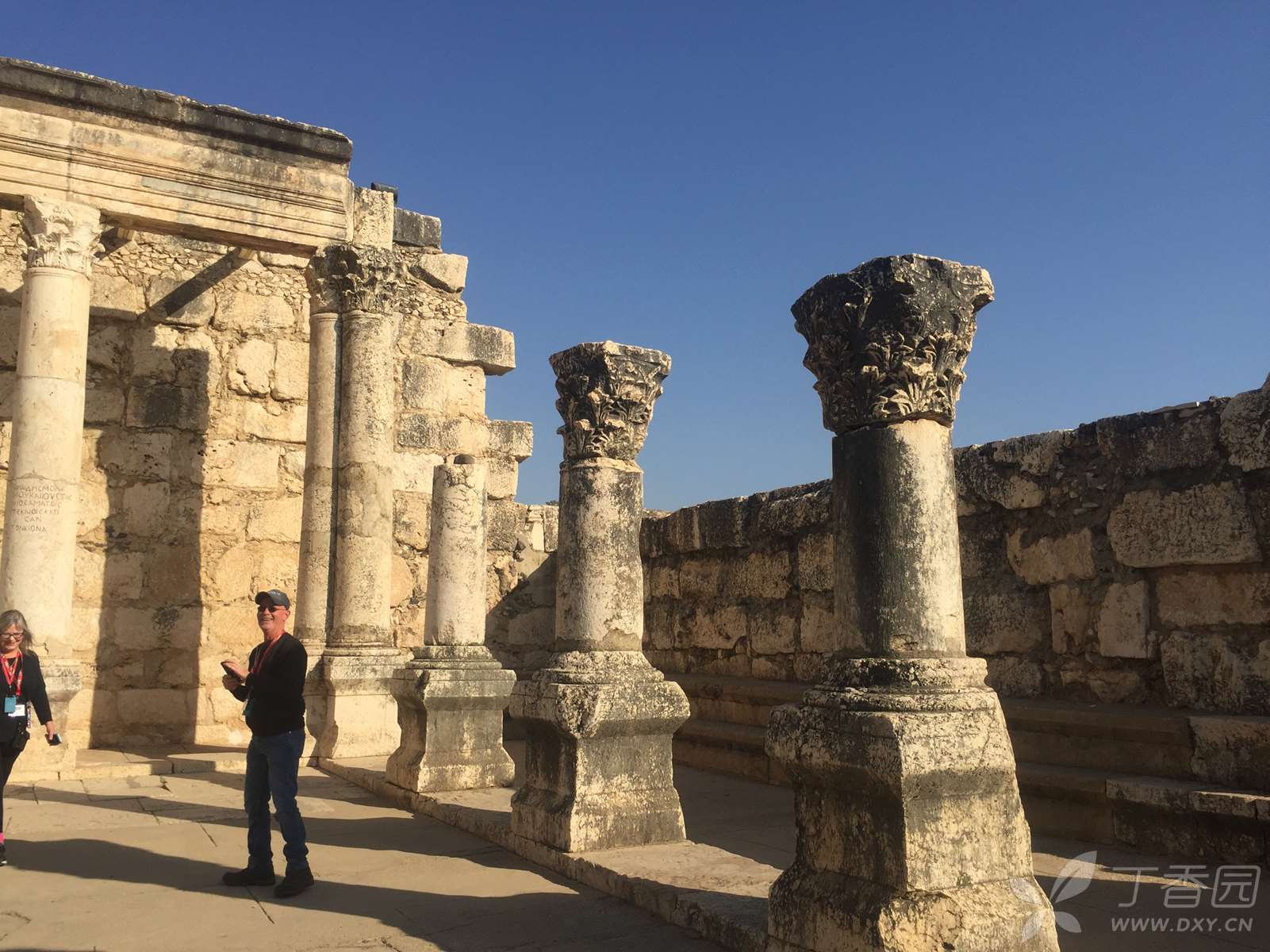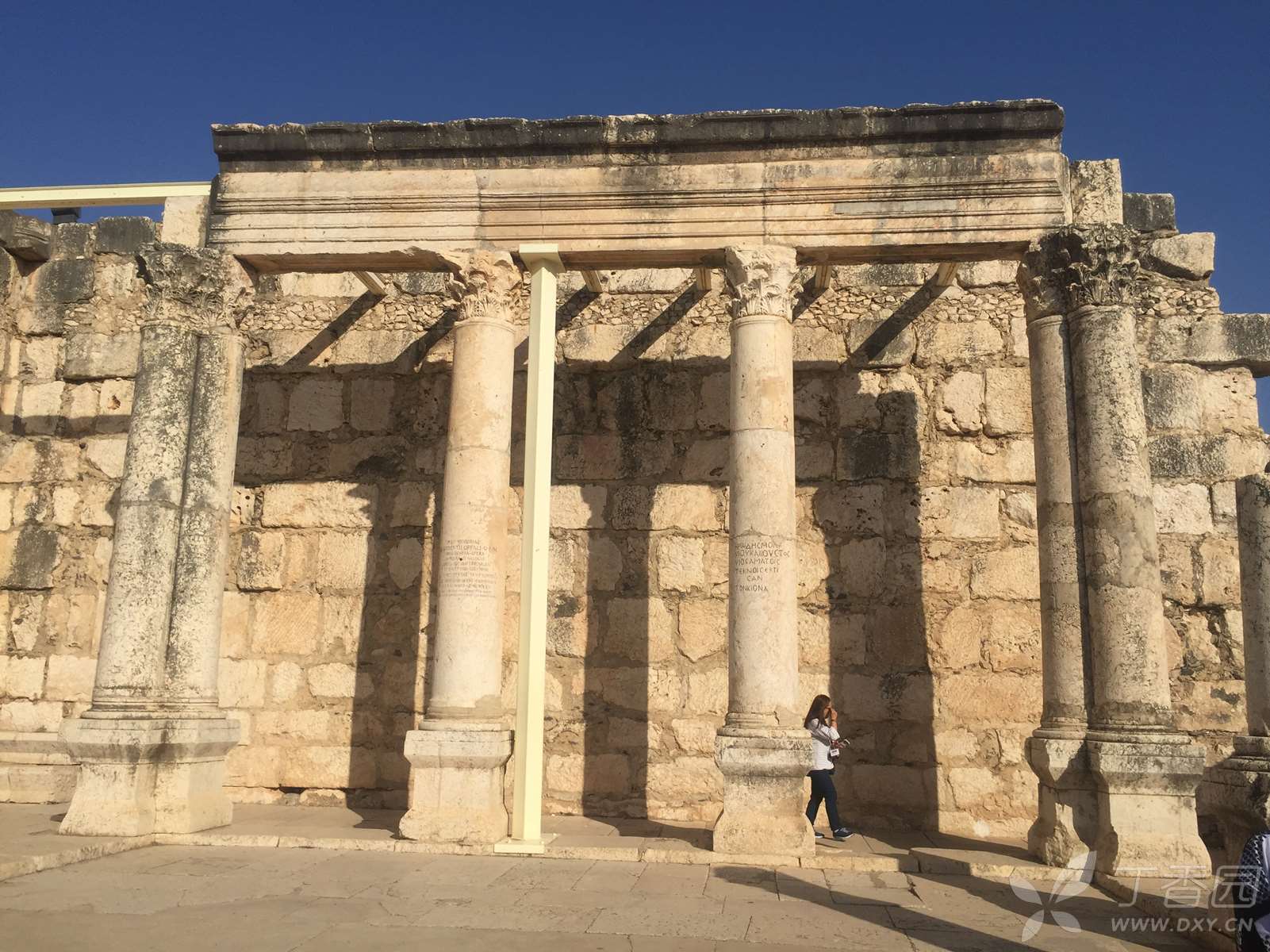 迦百农会堂的正堂呈长方形,除了入口那一面,其余三面都是走廊。东西两方的走廊上有两排长形石凳,供聚会者使用。一行白色石灰岩的圆柱,分开了走廊与正堂,我看到有的柱子上刻着字,写的是什么,没细看。看过的人说,中间有根柱子刻的是希腊文,“摩基莫斯(Mo[ki]mos)的(儿子)希律(Herod)和(他的)儿子犹士都(Justus)及他们的子女树立这柱子”。这么一算,这柱子就两千岁上下了。