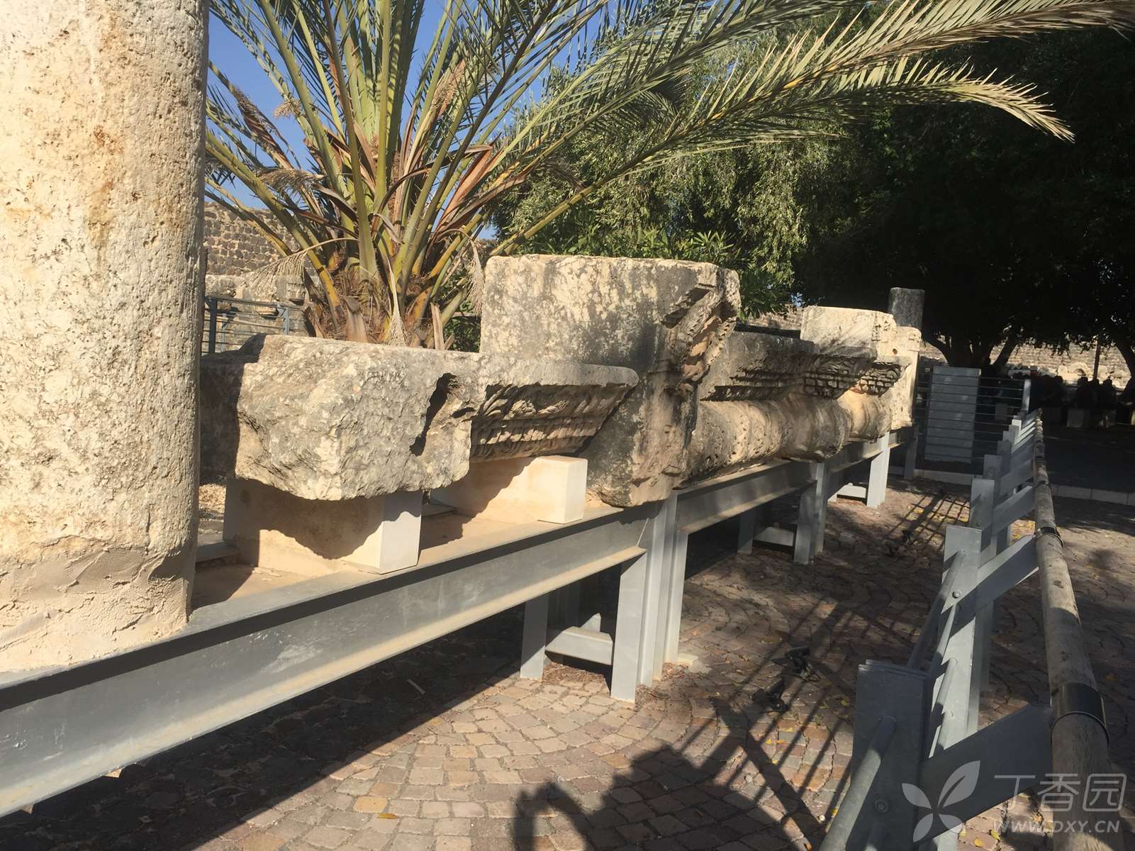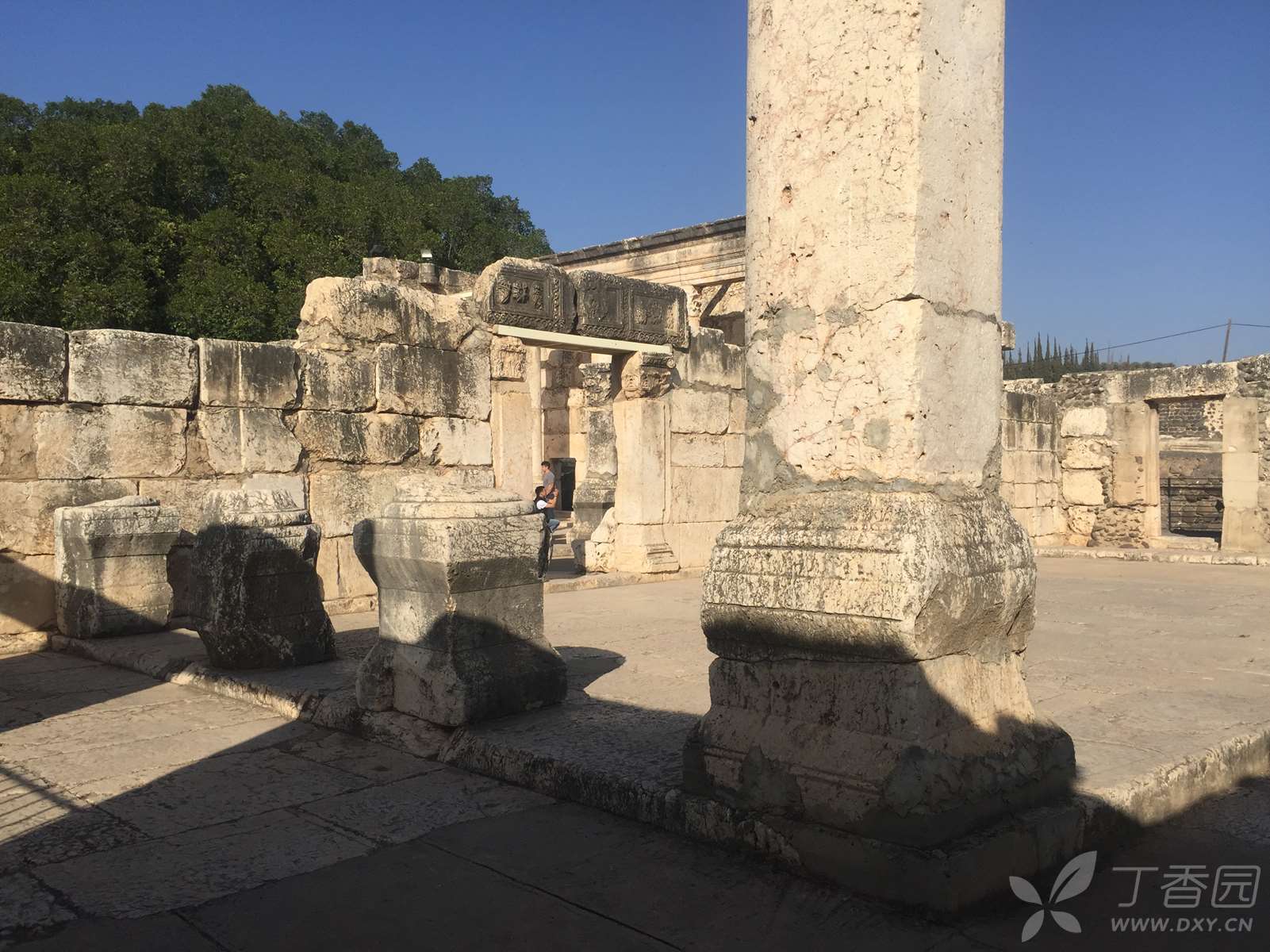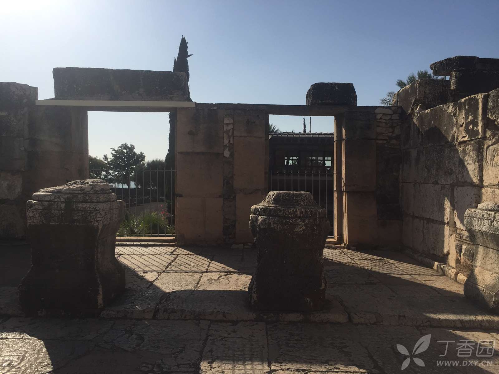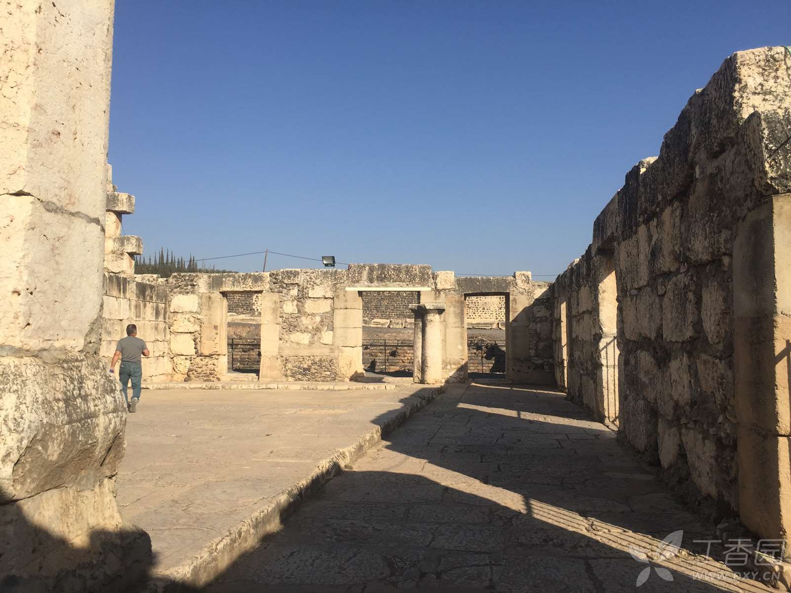 迦百农会堂的正堂呈长方形,除了入口那一面,其余三面都是走廊。东西两方的走廊上有两排长形石凳,供聚会者使用。一行白色石灰岩的圆柱,分开了走廊与正堂,我看到有的柱子上刻着字,写的是什么,没细看。看过的人说,中间有根柱子刻的是希腊文,“摩基莫斯(Mo[ki]mos)的(儿子)希律(Herod)和(他的)儿子犹士都(Justus)及他们的子女树立这柱子”。这么一算,这柱子就两千岁上下了。