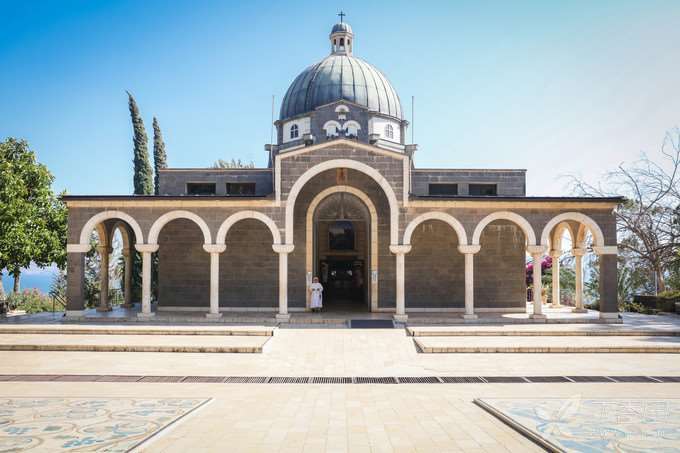目前的教堂建于1936-1938年,靠近4世纪加利利湖畔的八福山(Mt.Beatitudes),这里本是加利利湖北岸一座高丘,据《新约》上记载,有一天,几千信徒与民众跟随耶稣来到了这里,耶稣停下脚步,走上这座山丘,向追随他的数千名信徒民众训话,这就是基督教中著名的“登山训众”,传讲“山中宝训”,而且圣训第一部分内容论八福,故而得名,这在基督教历史和耶稣的生涯中被认为是一次十分重要的活动。