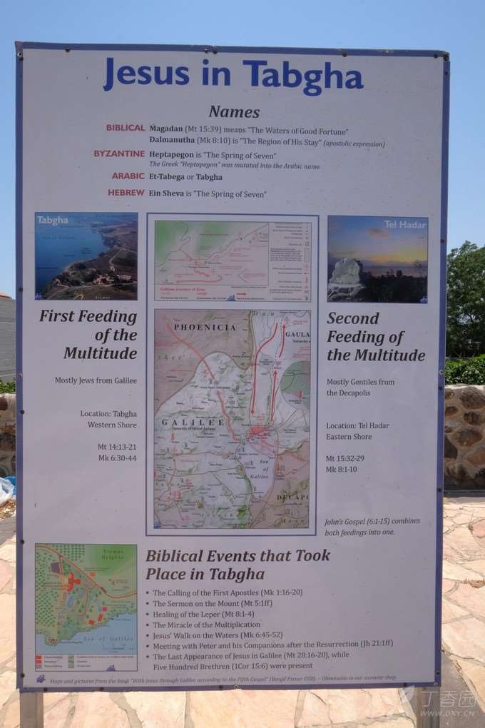 关于「五饼二鱼」神迹,其正确发生地点,是在加利利海西北岸一处名叫「塔布卡」(Tabgha)的地方。据说,Tabgha是希腊语「七座泉」的错别字,而该处的泉水含有丰富的琉璜,传说曾治愈约伯手部的皮肤病。