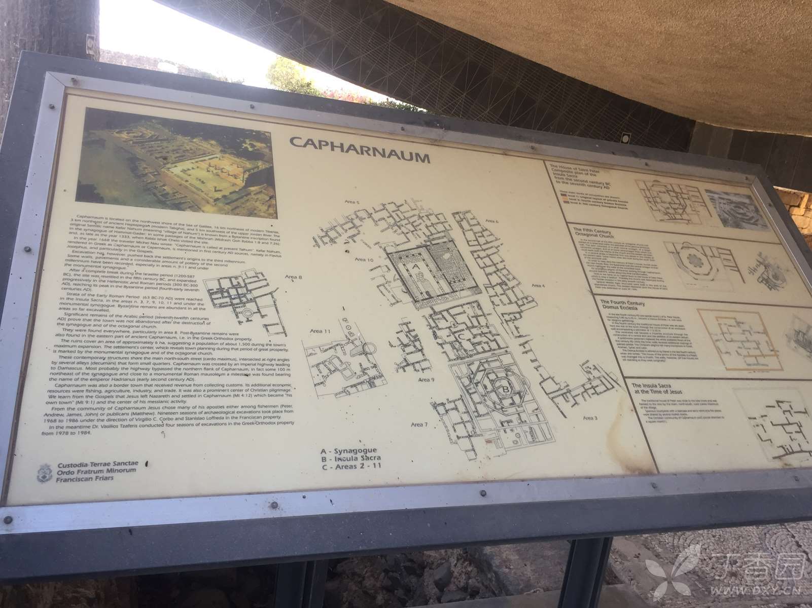 在耶稣之后,4世纪拜占庭时期在原来会堂的原址盖了新的会堂(就是现在游客参观的那个),而彼得的家也在5世纪时盖了教堂。到了7世纪因为阿拉伯人的关系,教堂和会堂被摧毁。 1894年方济会买下了迦百农2/3的地,剩下1/3由希腊东正教买走。可以看到就在围墙后有粉红色的建筑物,那就是东正教堂(不同出入口,免费参观) 今天住在迦百农的,包括一个希腊东正教的方济会的的修道院。这些遗迹的时期,多属公元七世纪早期至十一世纪。考古学者在这范围内的发现,有由玄武岩砌成的防波堤,由大石砌成供渔船使用的码头,建有水池的渔获市场,一所大型建筑物(七至十世纪),陶器(七至十一世纪),铜币及银币,罗马浴室,罗马石棺及坟墓(一至二世纪)等。