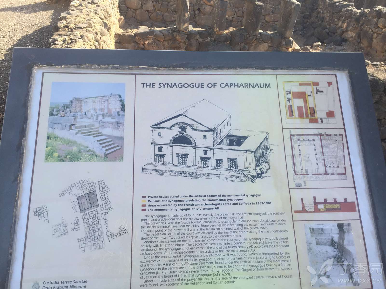 1968年之前,大家都以为这座就是主后一世纪的会堂。但经过考古学家 Virgilio Corbo 和 Stanislao Loffreda 从1968 至1986 年的挖掘,发现这建筑物的下面有另一座会堂的遗迹(图二)。那座会堂的四面黑色的玄武石墙和它的大鹅卵石地面(cobblestone floor)和一些陶器都被挖掘出来,证明了这才是一世纪、当年耶稣在迦百农传道的地方!现在看到的其实是四世纪时才建立的会堂。
