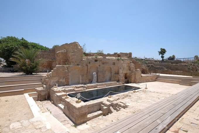 大希律在该撒利亚海岬所建最伟大的宫殿,远看像伸入海中的建筑。在王宫的中央,有一淡水池,其大小如现今的奥林匹克标准游泳池,池中曾竖立一巨型雕像。保罗很可能曾被囚在这里的地下监牢中(徒23:35)。当年的宫殿内部的游泳池,面对大海游泳