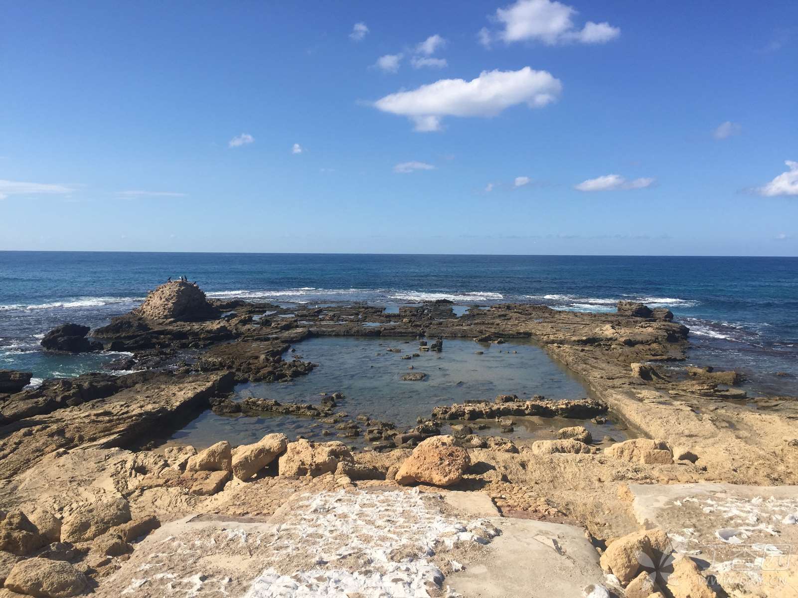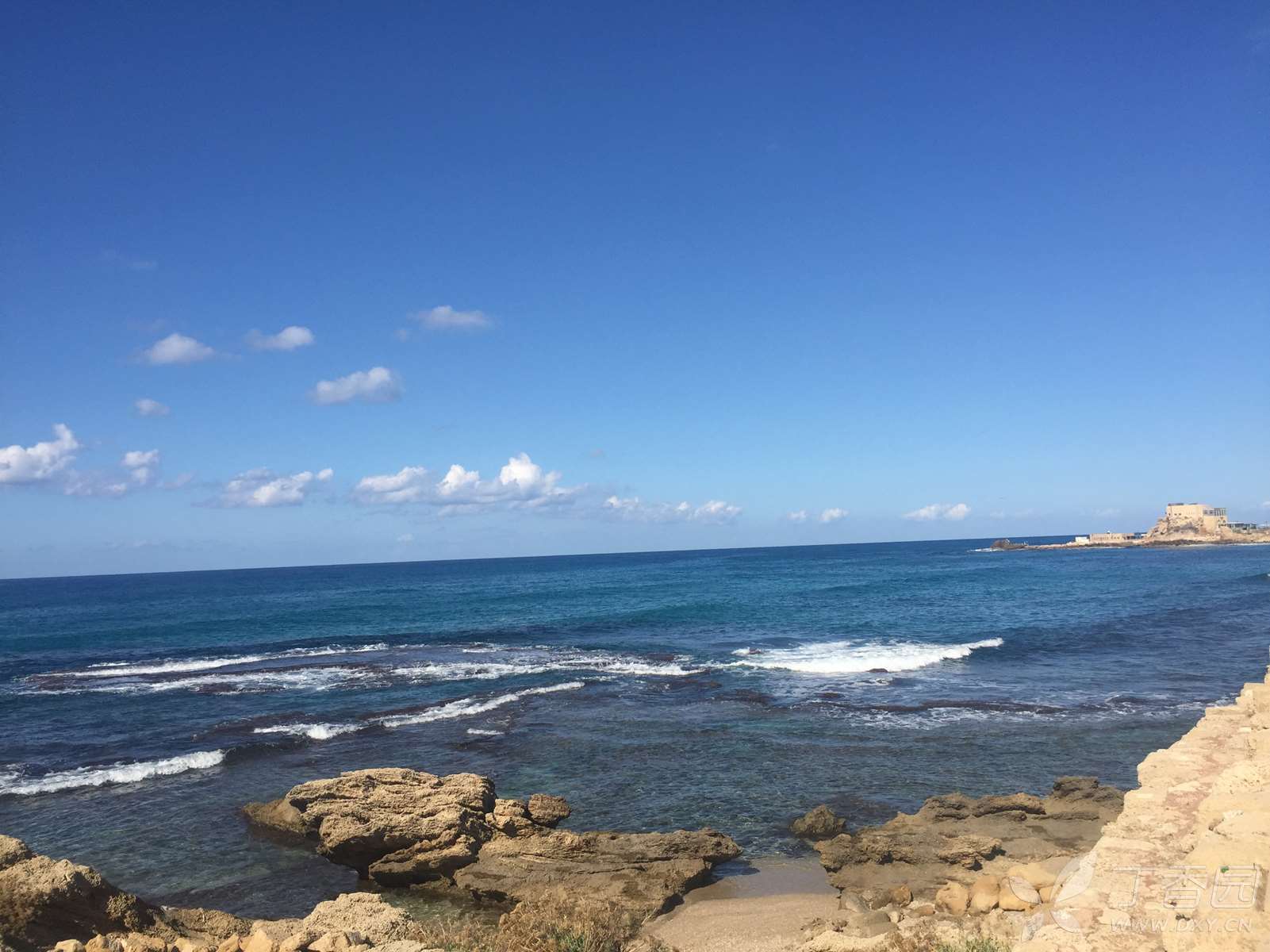 接着扑入眼帘的,是希律王建造的古码头。凯撒利亚曾是以色列王国在地中海的第一大港,但物换星移,当时繁忙兴盛的古码头现在只剩下根根断柱,横七竖八地浸泡在海水中,忍受着海浪不停的侵蚀。大海如青绒的地毯,依微风的韵调而抑扬吟咏,舒展流畅的乐声掺和着花草的芬芳,在带露的海风中飘逸、回荡,令人如临仙境,心荡神驰。