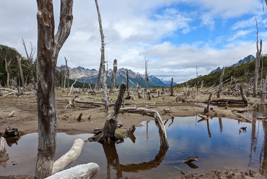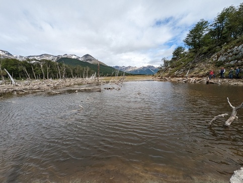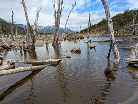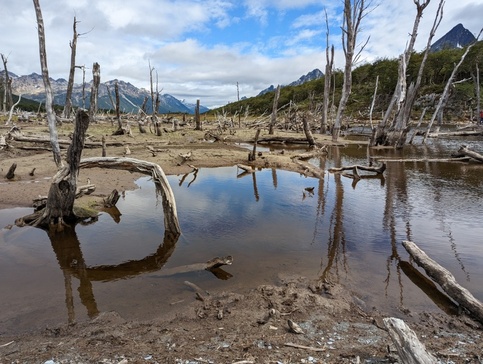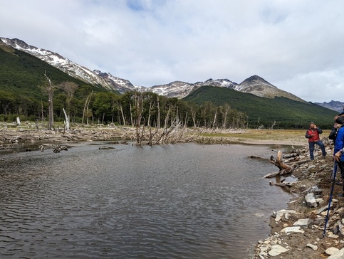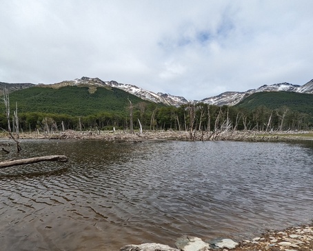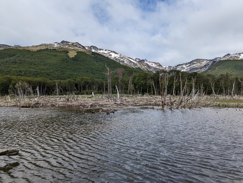 火地岛(Tierra del Fuego)位于南美洲的最南端,面积约 48700km2,1881 年智利和阿根廷划定边界,东部属阿根廷,西部属智利。阿根廷的火地岛区相当于一个省,它的首府乌斯怀亚是个只有 3 万人口的城市。火地岛主岛略呈三角形,西部和南部山地为安第斯山脉余脉,地面崎岖,海拔 1500~2000 米,最高峰约甘山 2469 米。雪线高度仅 500~800 米,现代冰川发育。东部和北部为平缓低地,海拔 180~600 米,覆盖第四纪冰川沉积和火山灰砾,多冰川湖和沼泽湿地,较大的有法尼亚诺湖。山区多森林,低地为丛生草原。山谷的湖很美。可是到处都是枯树,导游说这是从加拿大引进的河狸 Beleave,到了这里没有天敌,导致树木破坏严重。来自欧美的定居者将穴兔、美洲河狸、麝鼠、灰狐等动物引进该地,导致其大量繁殖后对环境造成极大的破坏。鸟类则包括 3 种类型的草雁(英语:Sheldgoose)-斑胁草雁、灰头草雁和白草雁,主要分布在开放式的海滩。其他鸟类包括巴塔哥尼亚啄木鸟、麦哲伦啄木鸟(英语:Magellanic woodpecker)、白簇鸊鷉、灰船鸭(英语:Tachyeres)、鸬鹚、鹭鸶、凤头鸭、雕和包括麦哲伦企鹅、巴布亚企鹅在内的多种企鹅,另外可见大秃鹫翱翔于火地岛的山峰和山谷间,此外该地也是南方椎尾鹦鹉(英语:Austral Parakeet)的故乡。已发现的海鸟则包括海燕、信天翁。水生动物包括扇贝、玉螺、少数甲壳动物如螃蟹、鱼类如沙丁鱼、智利黍鲱、无须鳕和水母等。哺乳动物如原驼、南海狮、安地斯鹿(英语:South Andean deer)、智利水獭也曾在园内被发现。