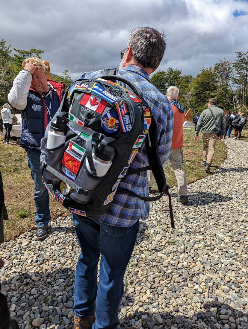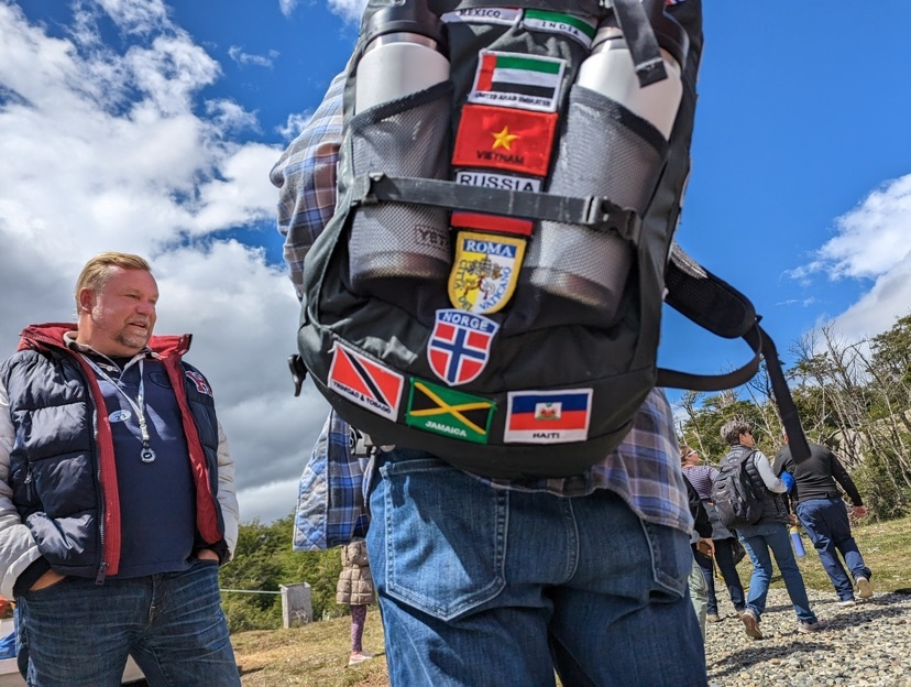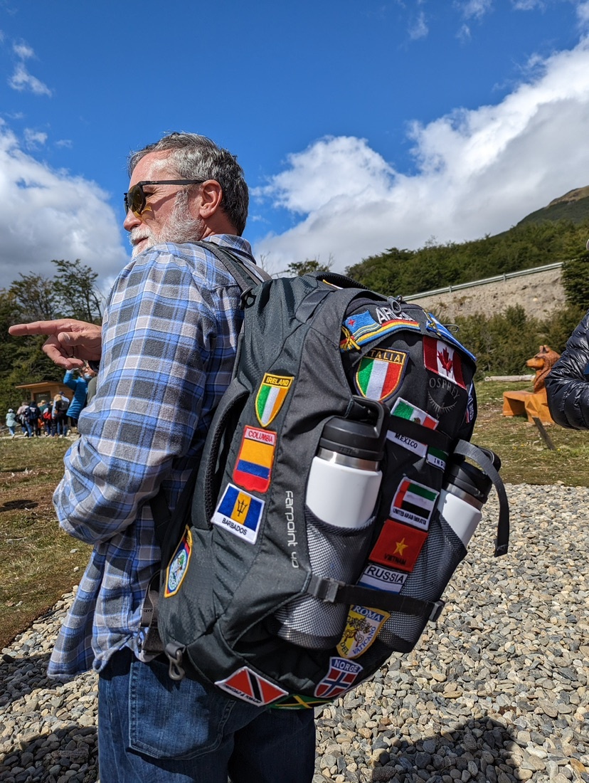 最后三张图 (图 789 ) 是我这次遇到的大神。做灾害救援的;他走一个国家就在包上加一个国家的图标。我大概扫了一眼,就感到这是一个很有故事的人。我想,出门的意义就在于此,看见不一样的风景,了解一些不知道的历史,进而建立一种自己以前没有的观察世界的角度。对他人也多一些理解和宽容。