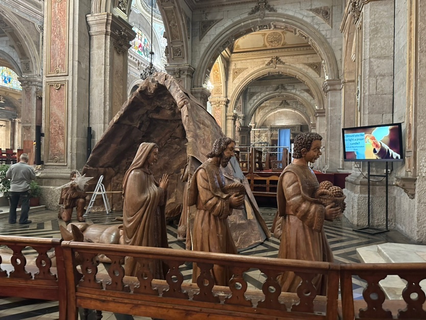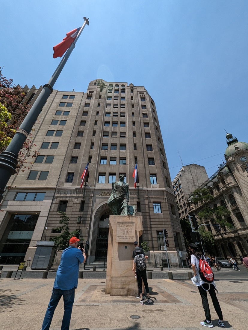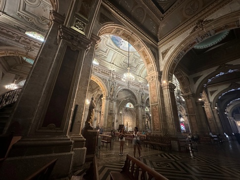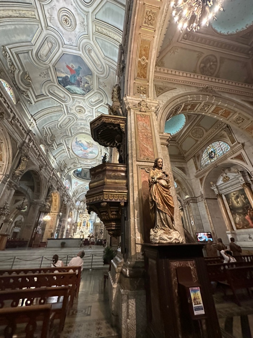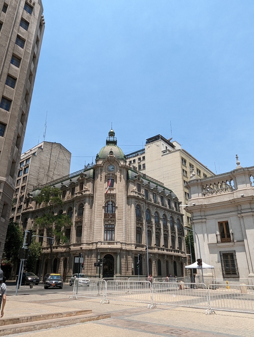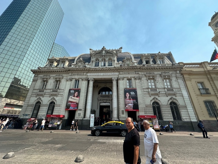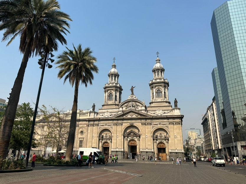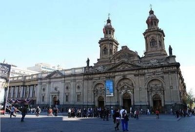 是天主教智利的圣地牙哥总教区的主教座堂,新古典主义建筑,建于 1748-1800 年,19 世纪末形成目前的外观。圣地亚哥大教堂始建于1748年,原教堂无钟楼。1780年当时的主教向西班牙皇室推荐罗马建筑师华金·托埃斯卡进行大教堂和小教堂正面的修缮,教堂加以了新古典主义风格,两座钟楼在他去世一年后的1800年底完成。该教堂内共有三个拱形长廊,每个长廊长度均超过90米。堂里圣弗朗西斯科・沙乌略的木制雕像(图九)以及重达二十多千克的 17 世纪的银制灯具都很值得一看。