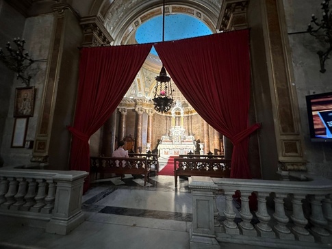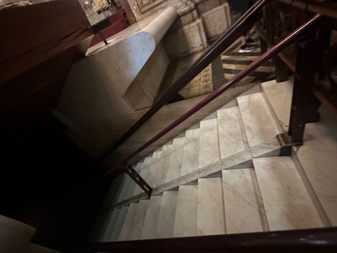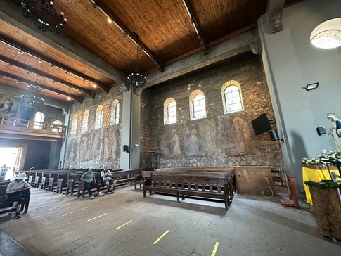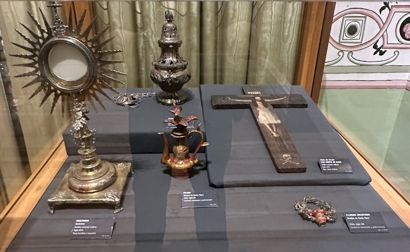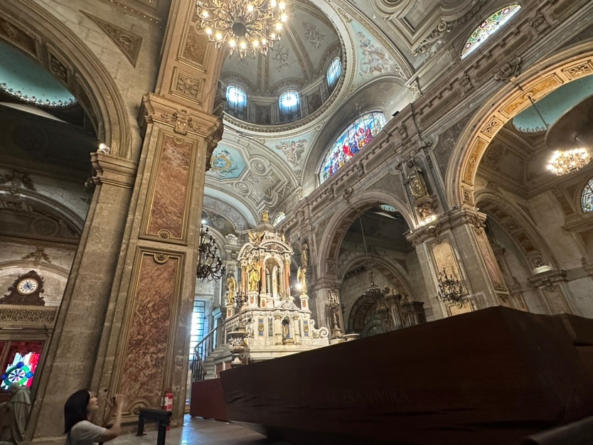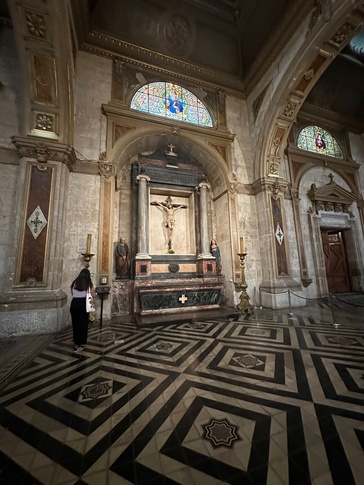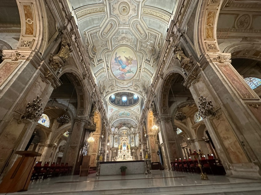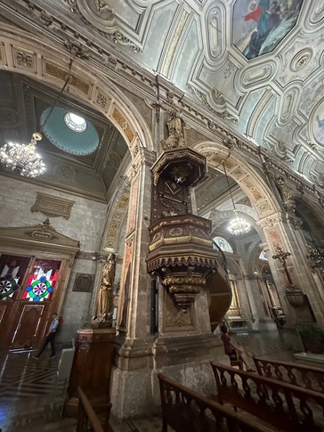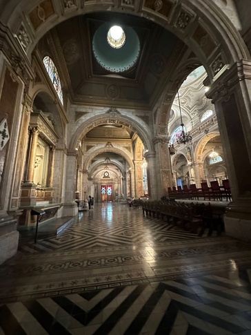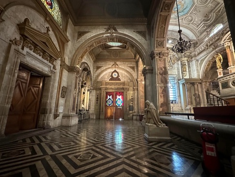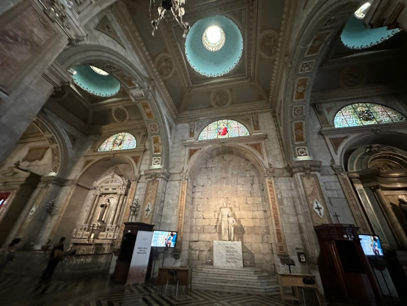 大教堂内共有三个拱形长廊,每个长廊长度均超过 90 米,智利历任大主教的遗骸均保留在此(图九走下去就是历任大主教的遗骸保存处)。教圣具放置处的《最后的晚餐》图也非常值得一看。大教堂的南侧是大教堂博物馆,共有三个展厅,展示有圣具、宗教绘画等。