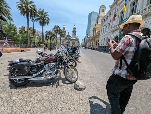 在武装广场散步赶上一年一次的地狱天使集会。这个集会一年一次,在全球选定的一个地方,今年此刻今天刚巧选在这里被我撞见。地狱天使是个黑帮摩托党集会,这个黑帮全年都在黑暗里,只有这一天从地狱变成天使,走在阳光下,这一天绝不做坏事。很多人上去合影,我和这类人气场不对路。远远的就觉得很不舒服,于是只是拍了一个远景照片。