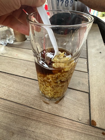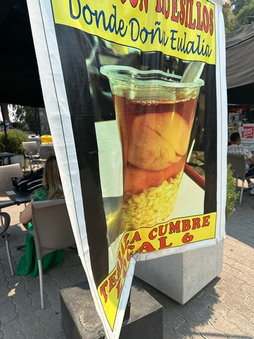 智利这里有一种很特色的糖水饮料叫做 Mote con huesillo,我原则上出门是不太吃街边食物,担心腹泻影响下面的行程。可是这个几乎所有的攻略上都推荐,当地导游也强推。我就唱了一小勺。像是止咳糖浆和冰红糖水泡薏米仁。查了一下,粗暴强翻过来就是大麦桃子汁,加了很多红糖和肉桂。如果像我这杯没桃子的,就叫做 “descarozados". 做法也很简单,一个锅里煮大麦仁 / 薏仁直到煮软。另一个锅里放进去泡开的干桃子干和肉桂还有巨量的糖一起咕噜咕噜炖。炖 30 分钟以后关火,把之前煮软的麦仁倒进去再放凉到冰冰的,就可以吃了。这玩意儿实在是糖尿病自杀套餐… 看看就可以了…