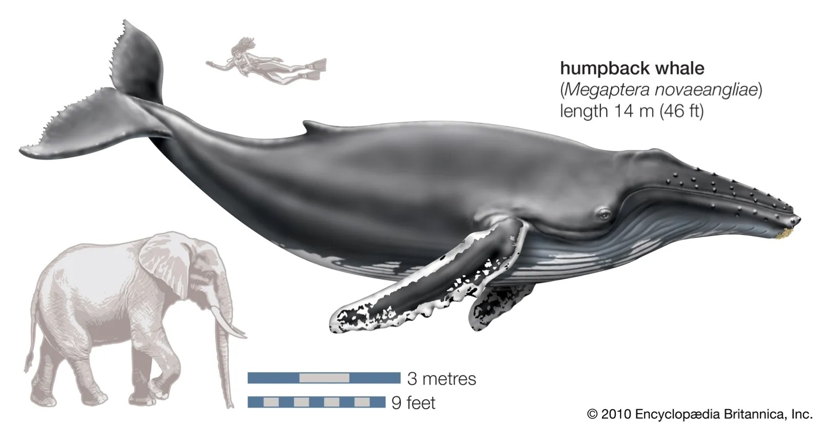 为热带暖海性鲸类。身体较短而宽,一般长达 13~15 米。大翅鲸为大型须鲸,胸鳍特别的长,约占身体的三分之一。成年鲸身长可达约 11.5 至 16 公尺之间(39 至 52 英尺),少数大个体雌鲸体长可超过 18 公尺,成年雄鲸平均体长 13-14 公尺,成年雌鲸为 14-15 公尺 [5]; 刚出生的仔鲸长约 3 至 6 公尺。成年鲸体重 25 至 40 公吨,最重可达 60 吨,新生仔鲸重 1 至 2 吨。座头鲸以其跃出水面姿势、超长的前翅与复杂的叫声而闻名。活动时多一双一对活动,性情温顺,有洄游习性,惟游泳速度较慢。主食为小甲壳类和群游性小型鱼类。
