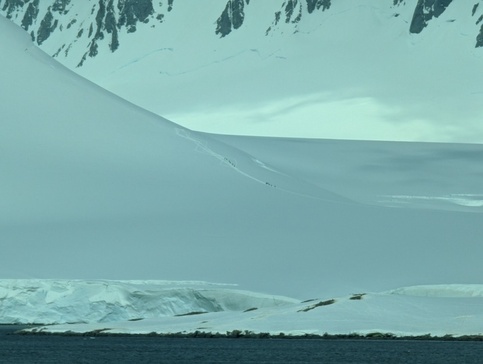 这是我在 paradise bay 拍摄到的一群帝企鹅在行走。帝企鹅在南极很难遇到,因为它们生活在南极的内陆。冬天在南极内陆深处产卵孵化。在夏天,帝企鹅带着刚长大的宝宝转移到南极大陆的海边。但是除了在海边吃饭,它们生活区还是在内陆部分。帝企鹅是唯一 一个在南极的冬天孵化的动物,它们牺牲、团结、夫妻同心,要克服非常非常多的困难, 用极度的饥、疲劳、鲜血、甚至是自己的生命,对抗严寒对抗猎食者,对抗命运 — 去搏一个让下一代诞生的机会。